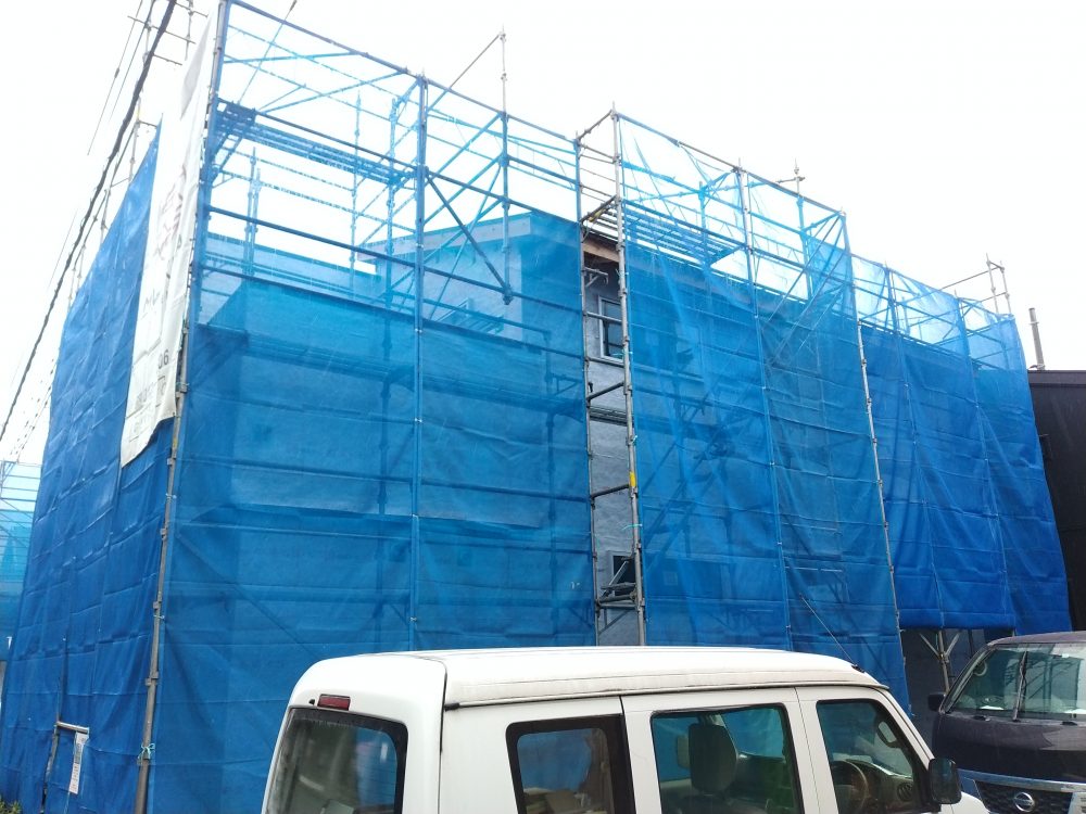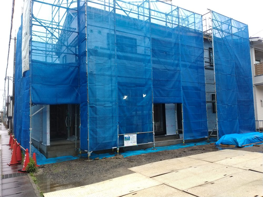 6,9号棟共に無事に上棟が終わり、耐力面材「ダイライト」が貼られ、現在防水シートを施工中です。