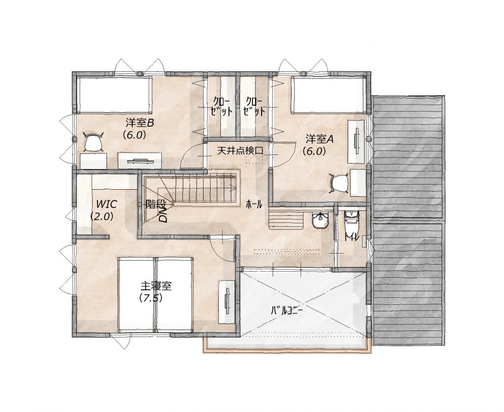 7.5帖の主寝室・6帖の洋室が2部屋の計3部屋ございます。