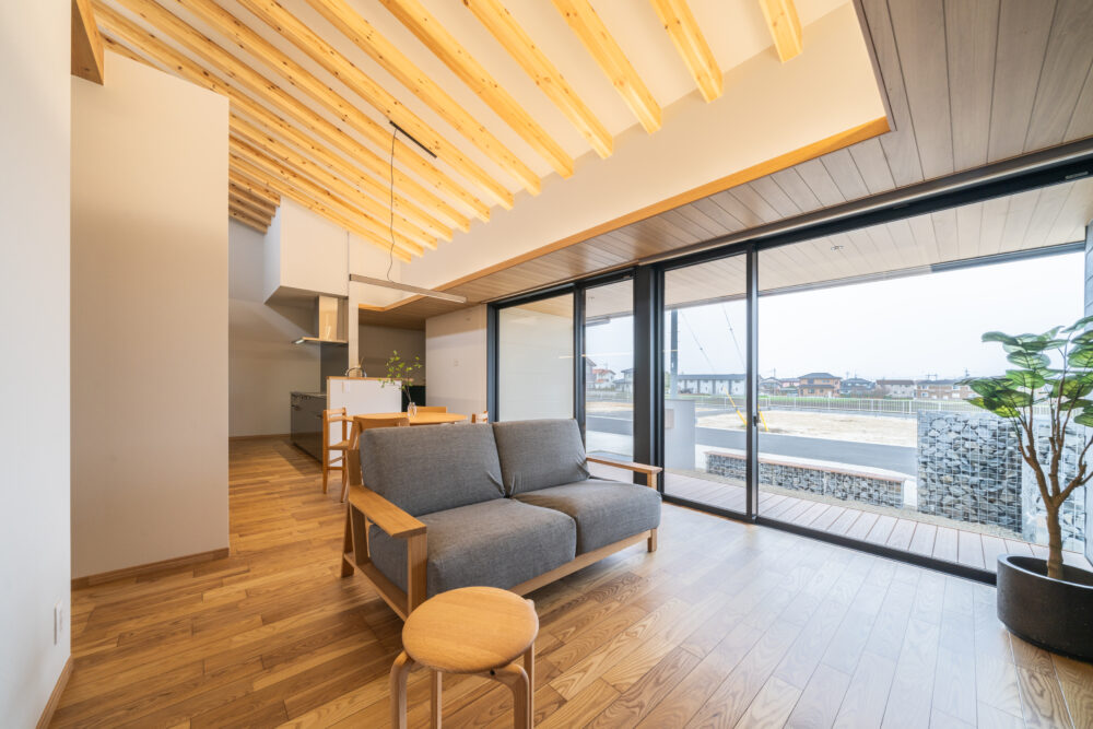 LDKは広々20帖。勾配天井や見せ梁を全面に出すことで開放感、デザイン性に優れたリビングとなっております。また、掃き出し窓も特注サイズを採用しており、全面ガラスかのように感じられるのがポイントです。