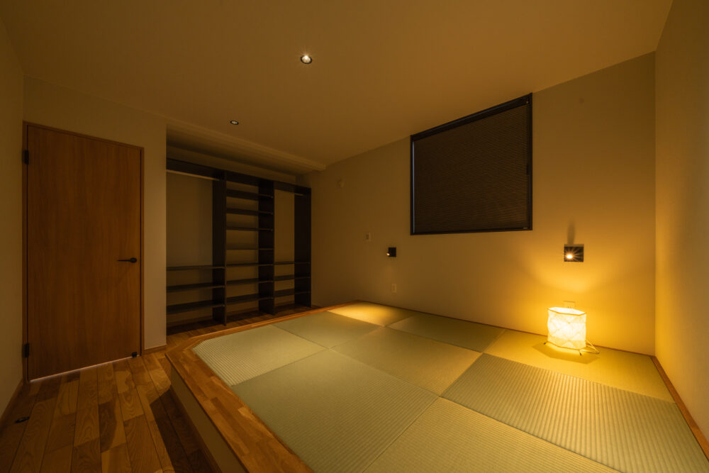 和モダンな雰囲気でリラックスのできる主寝室となっております。タタミには保温・断熱効果があり夏は涼しく、冬は暖かいので年間を通して快適に過ごすことが出来ます。また、ベッドを置く必要がないので布団を畳めば寝室以外の用途でもご使用可能です。