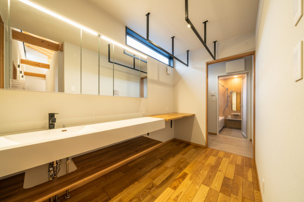 また、3.5帖の洗面室+1.5帖の脱衣室+2帖の浴室が一直線上の動線に配置されていますのでランドリースペースとしてご活用頂いても狭さを感じない、ゆったりとした空間です。