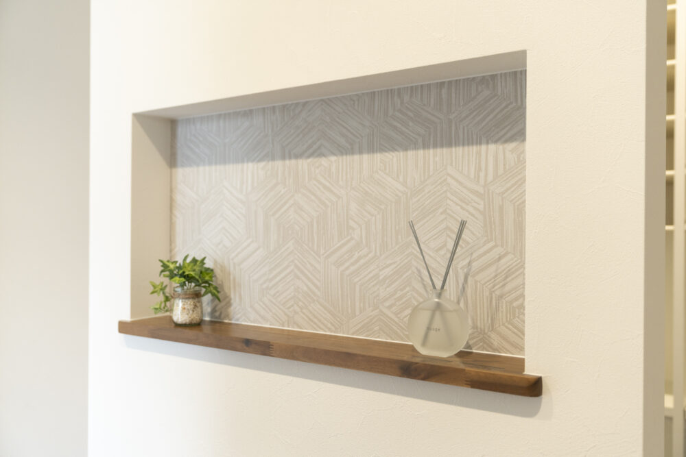 玄関には、ニッチにアクセントクロスが採用されています。壁の1面にも同じデザインのクロスを使用しておしゃれでかつ統一感のある雰囲気に仕上げました。奥にはSCもあり、ロールスクリーンが付いているのでお客様に収納を見せることなく使用することが出来ます。