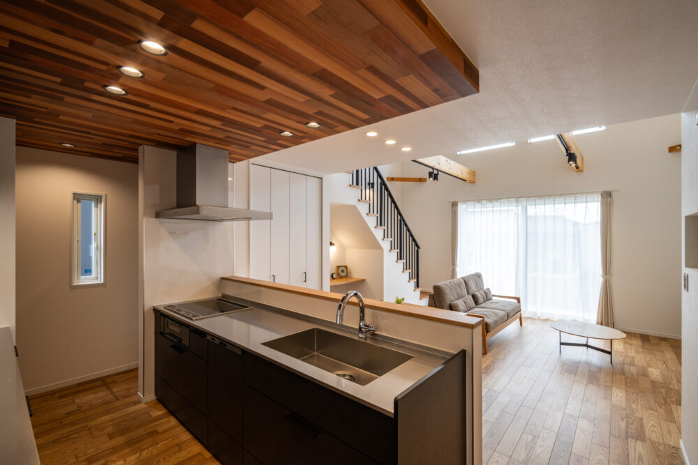 内装にもこだわっており、キッチン天井にはアクセントで濃い木目調が採用されていて、空間が引き締まり高級感のあるおしゃれな印象を与えてくれています。