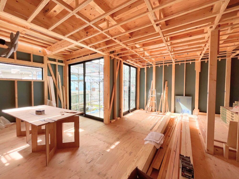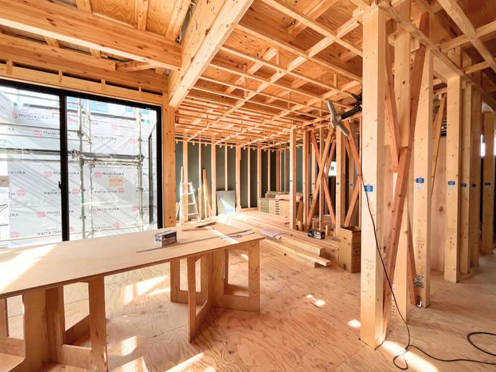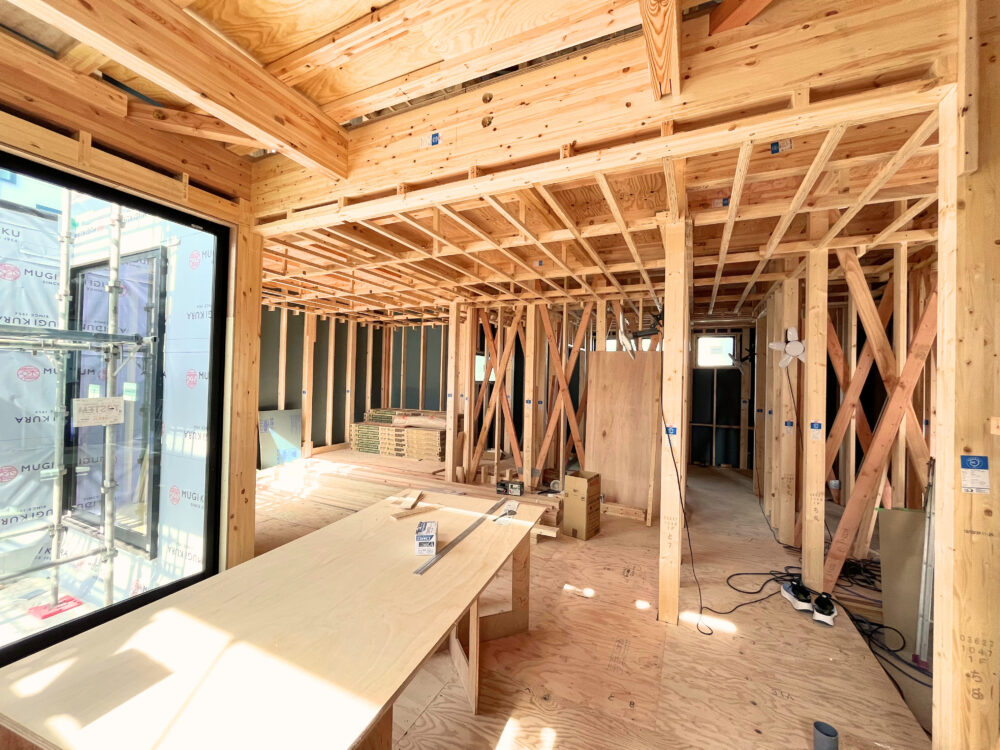木工事も進み、それぞれの部屋の大きさや位置関係がなんとなくわかるようになってきました。完成が待ち遠しいですね。