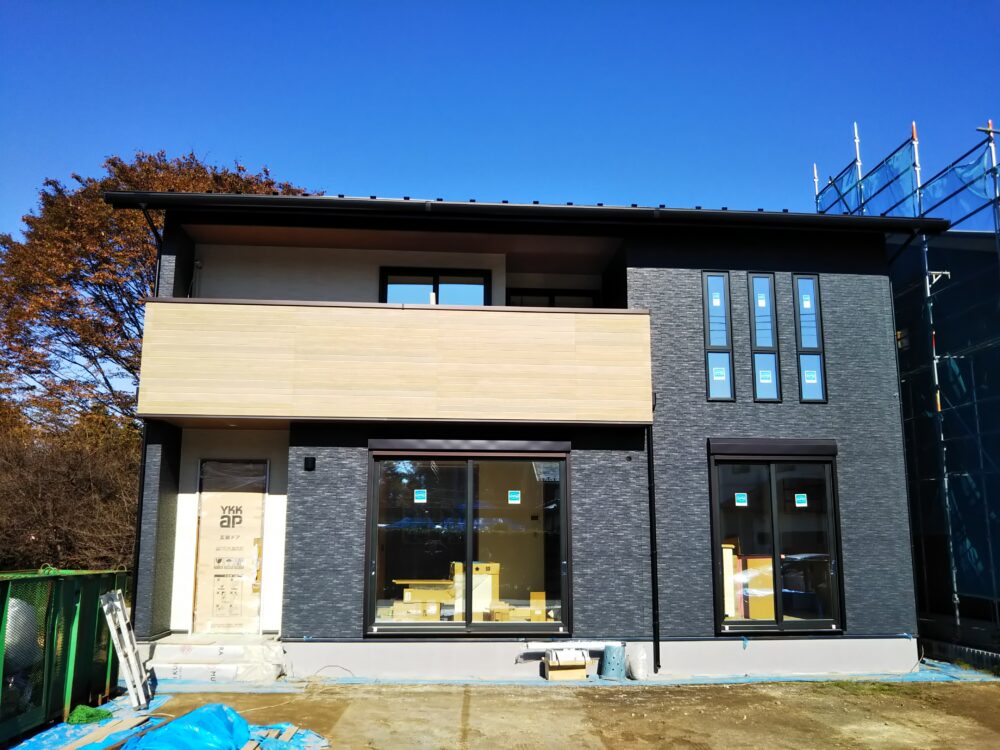 暗めのネイビーがメインの外壁色なのに対し、凹凸部分の木目調やホワイトカラーが程よいアクセントになっていますよね^_^