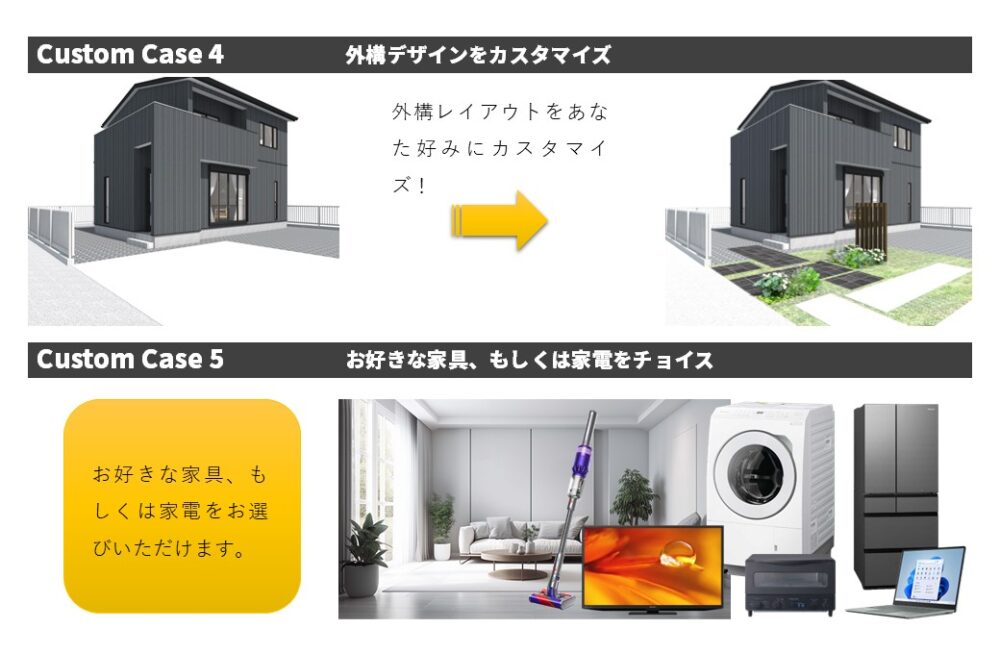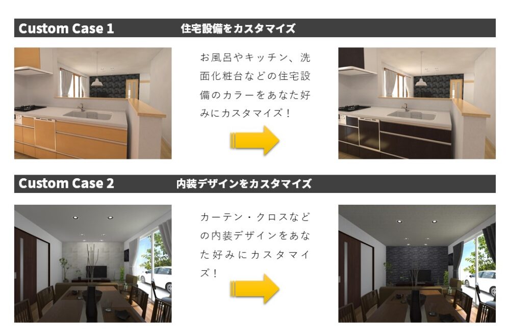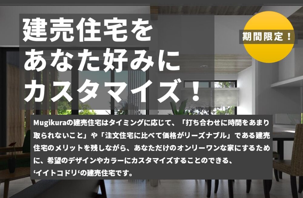 現在、建築中の建売物件では、期間限定で建売住宅をご希望のカラーやデザインにカスタマイズできるキャンペーンを行っております。あなただけのあなた好みのおうちをセレクトしてみませんか?