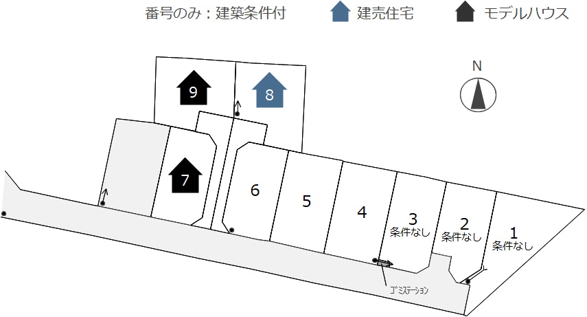 限定9区画の販売となっており、そのうち2区画(7・9号地)はモデルハウス、1区画(8号地)は建売物件を計画中です。