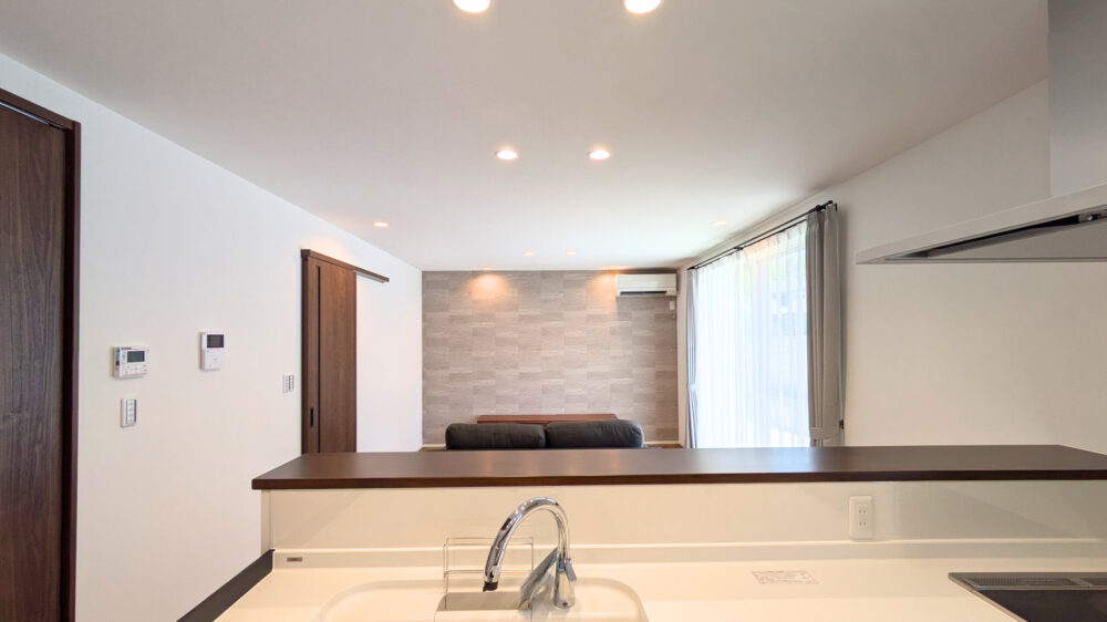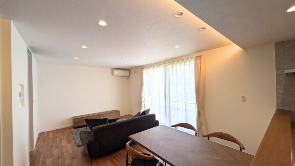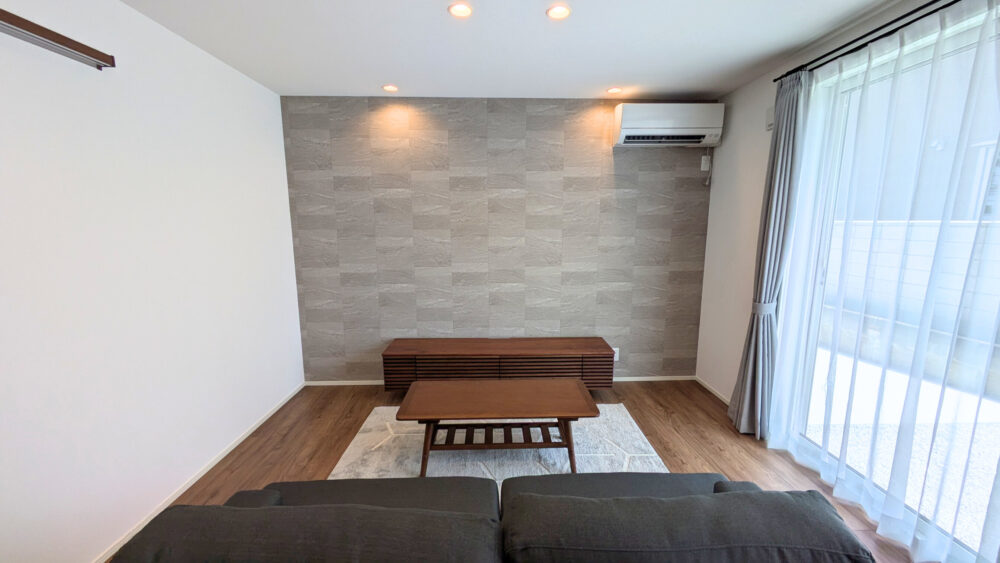 目を引く壁紙とダウンライト、テレビ台の組み合わせは大人な印象に仕上がりました。