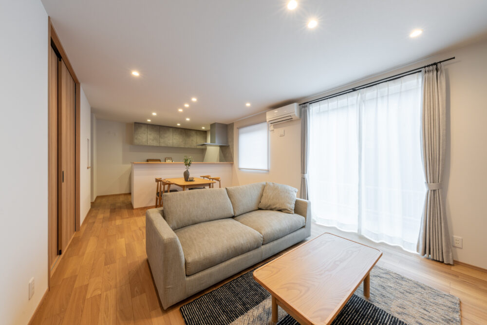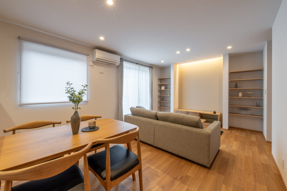 内装デザインはナチュラルな色合いで、TVボード背面の間接照明が落ち着いたおしゃれな雰囲気を演出しています。