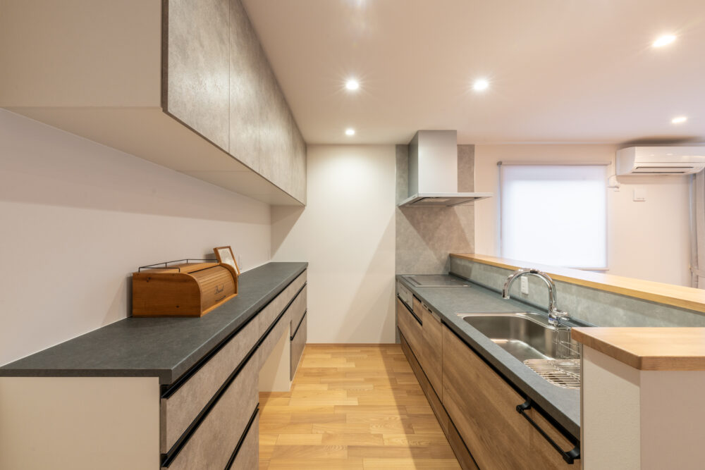 キッチンのカラーに合わせて、カーテンやソファ、ラグもグレー系で揃えることで統一感のあるコーディネートに。