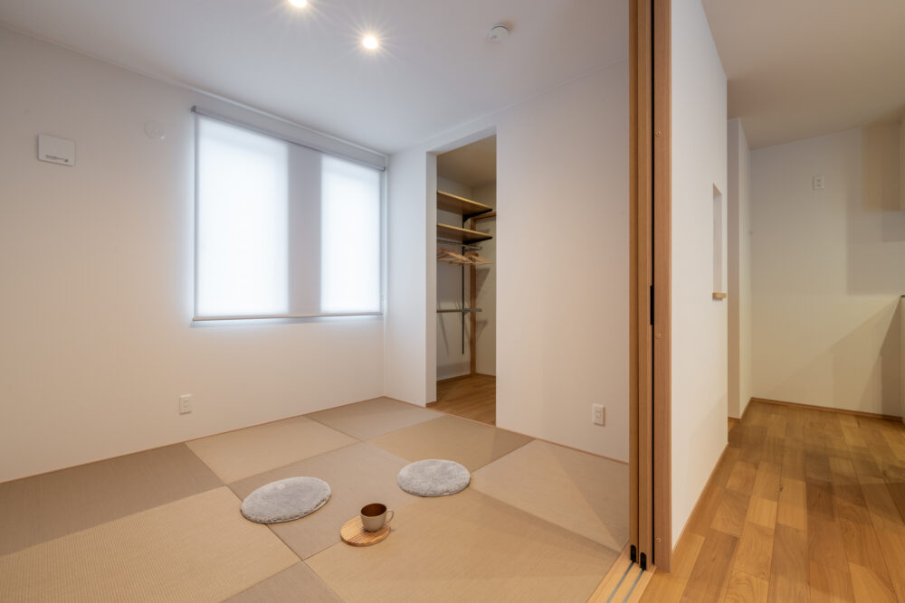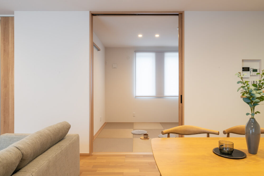 リビングとつながる和室は、ベージュの琉球畳で「和」すぎずモダンな雰囲気の空間になっています。