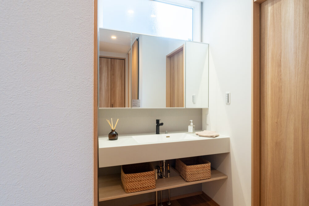 3面鏡の背面は収納になっているので、生活感のある歯ブラシなどのグッズもすっきり隠すことができます。