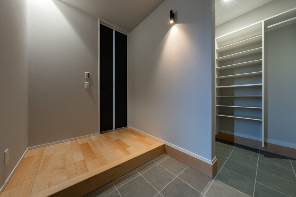 広々としたシューズクロークには、服を掛けられるスペースも。