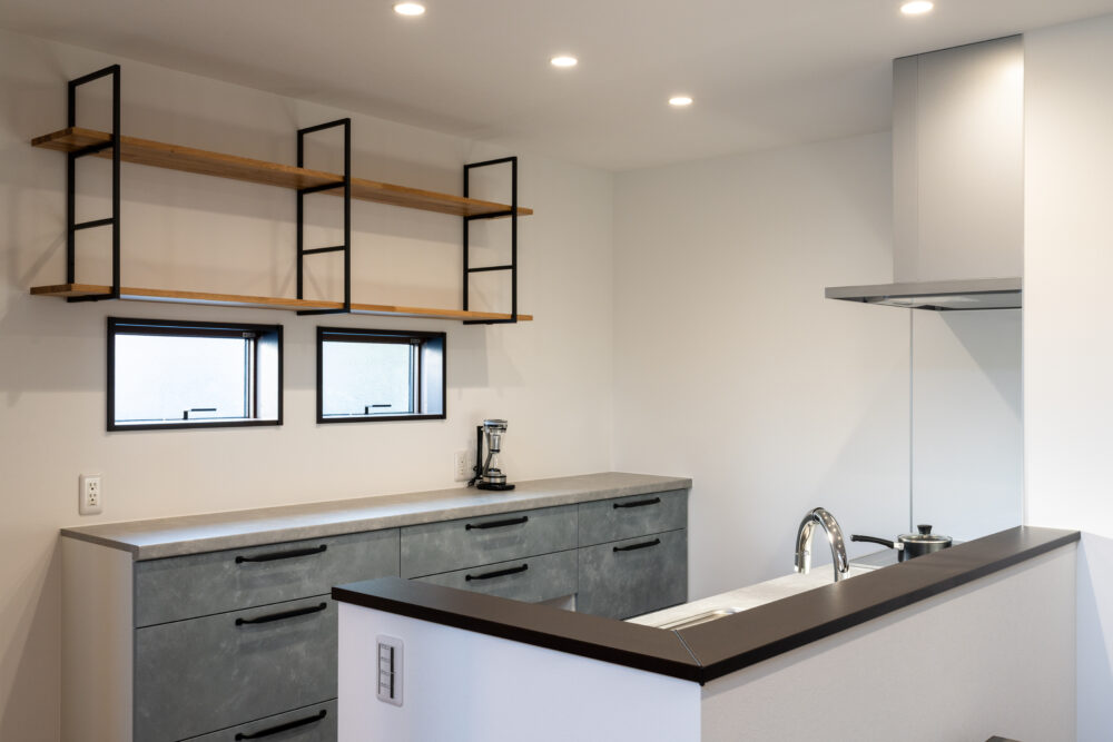 ブルーグレーのキッチンは重たい印象を避けながらも、