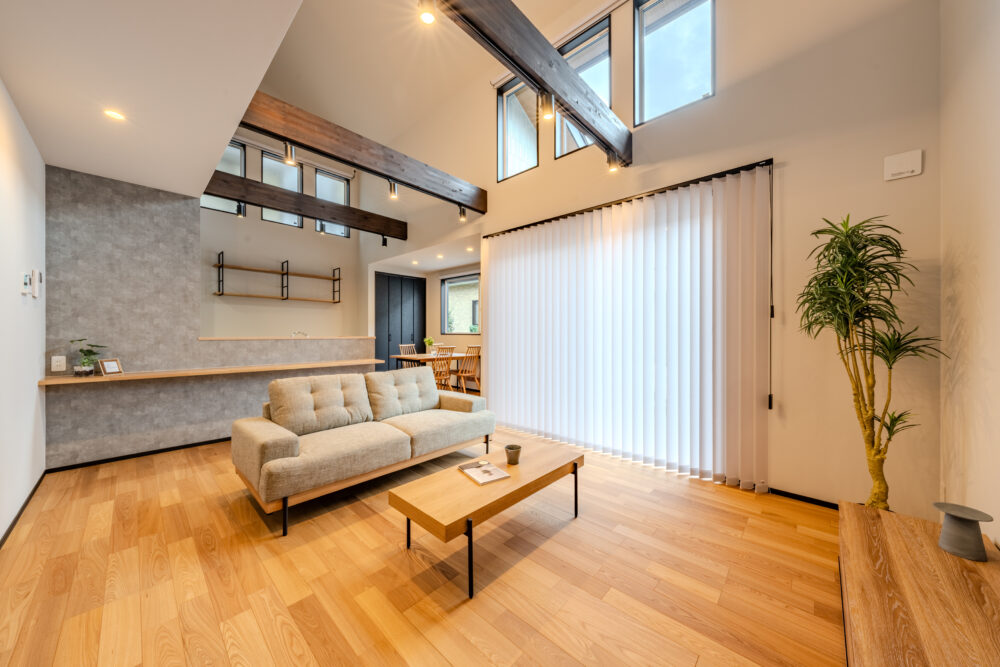 高い位置に面した窓が多く、吹き抜けの開放感をより強く感じさせます。
