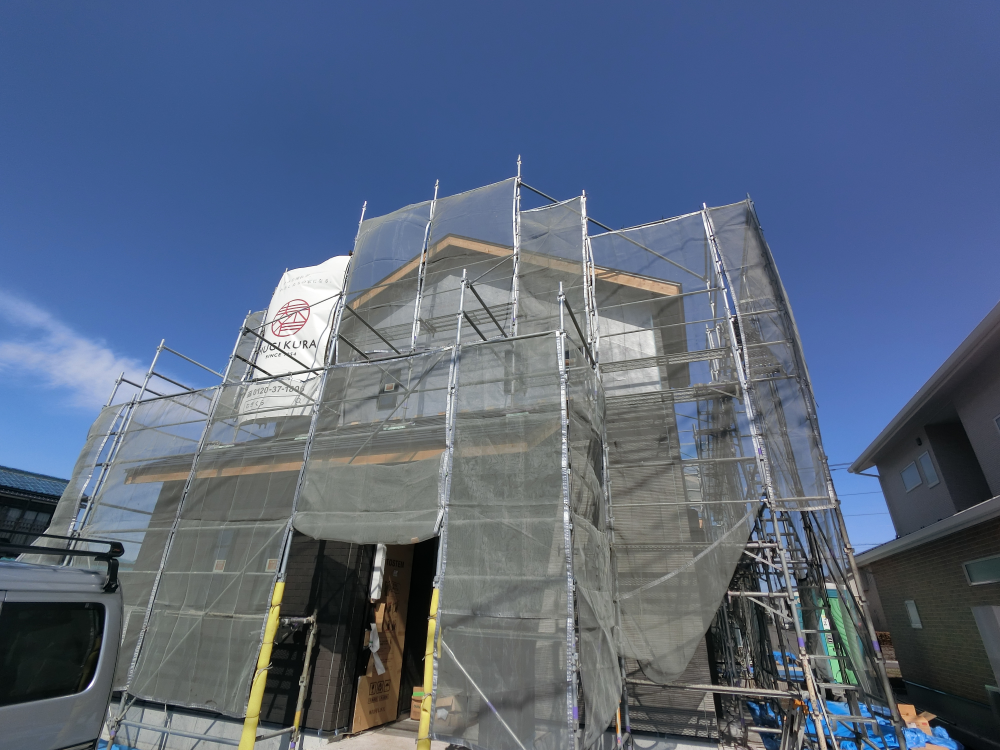 徐々に外壁が貼られています。建物の耐久性に関わる大事な工事、熟練の職人さんの腕の見せ所です。