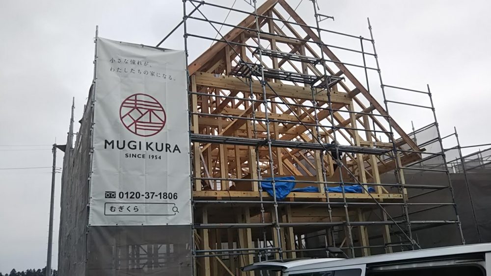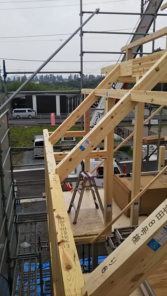 「カネ勾配」という傾斜角45°という急こう配の屋根ですから(通常は20°~25°)、大工さんたちにも、いつもよりじっくり時間をかけて安全に施工してもらっています。