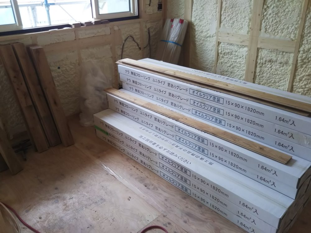 当物件はナラの無垢床板を使用しており、通常床板の幅が303㎜のところ90㎜の床板の為、なかなか貼る面積が延びず大変そうです。大工さんごめんなさい。。。