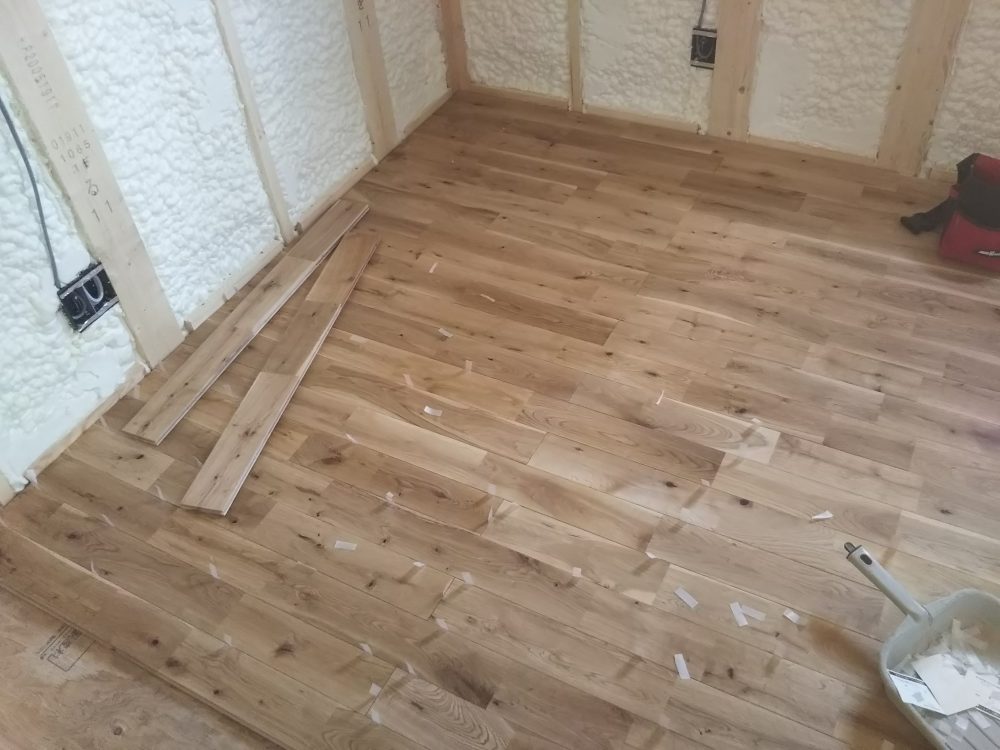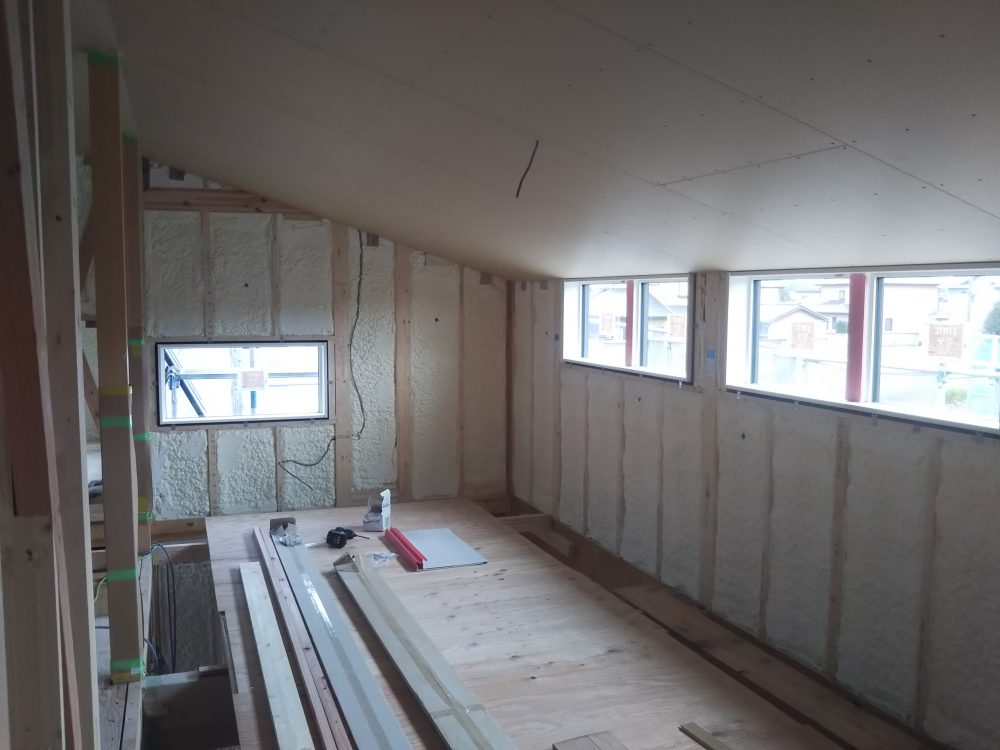 先日、吹付断熱工事が完了しまして、現在大工さんがフローリング貼りを行っております。