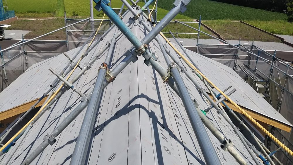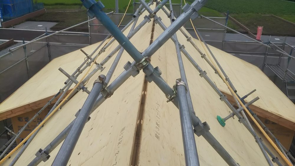 屋根の形状が矩勾配(角度90度の急こう配)ということもあり、外壁工事が始まっていない現時点でも、かなり存在感を出しています。