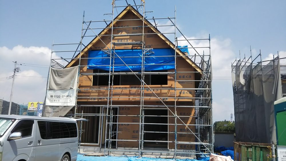また外回りはダイライトという地震に強い面材を貼り終わっており、屋根は板金工事が完了しています。