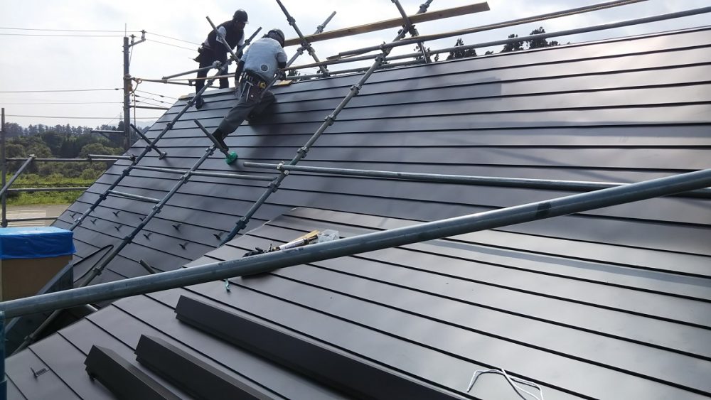 ベニヤ下地に防水の耐候性の高いゴムアスファルトルーフィングを敷いてから板金屋根を施工しています^^