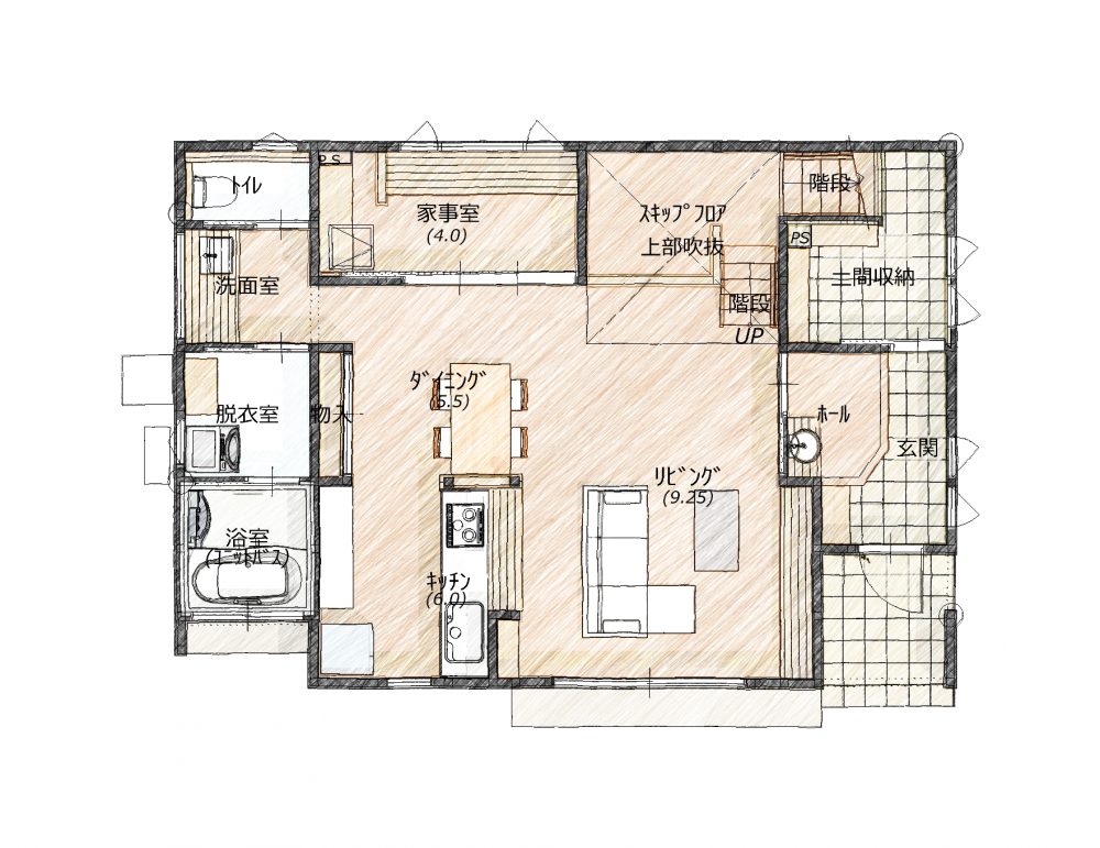 やっぱり家事がしやすい動線でなくては、リラックスできる広いリビング。