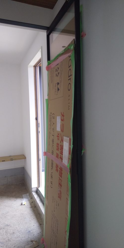 まず、玄関上がって左手側には、土間リビングに通じる扉がございます。汚れないように段ボールで養生され、全貌はベールに包まれています。一体どのような扉が付いているのか現地にてお確かめください。