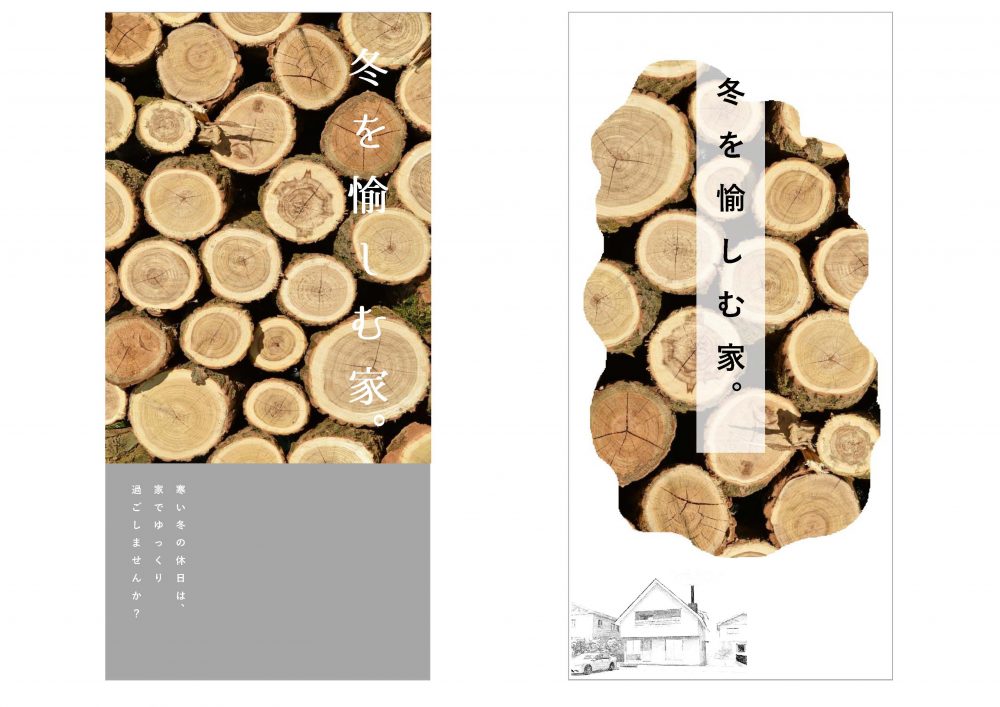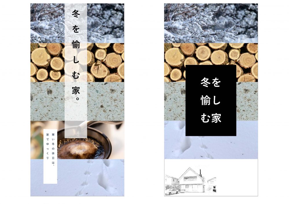 最初、現地看板のデザインは“冬を愉しむ家”のコンセプトに合うように、冬の景色や建物に使用している大谷石などの素材写真を使って案をつくってみました。建物のイメージが伝わるように、色々と詰め込んだデザインでいくつか案をつくってトヨパチメンバーに多数決をとったところ、結局写真を一枚だけ使った一番シンプルなデザインに決定!