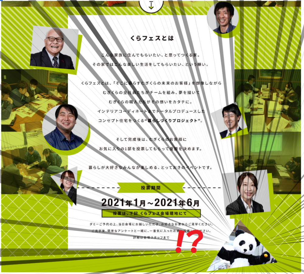 まず、TOPページのニューくらフェスロゴマークから進んでいただきますと、第1回の様子が見られます。次に、くらフェスの事、各チームの打ち合わせの様子を背に6名の“ご尊顔”がお出ましになられます。今回のくらフェスが、全社員で取り組んでいる事は、お知らせした通りですが、この6名は各チームのリーダーなのです!更に、社長の挨拶があり、各コンセプト住宅へ進める案内があります。建物の詳細については、進んだ先でご確認下さい。