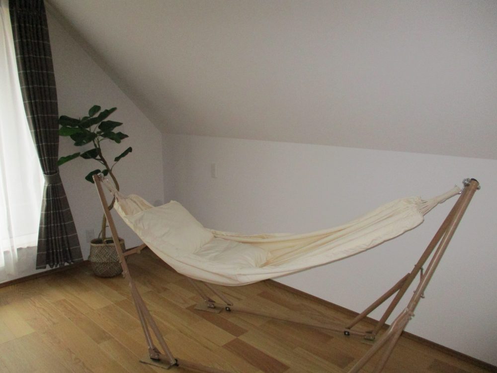 斜めの天井が特徴的な2階のお部屋には、ハンモックを設置しました。