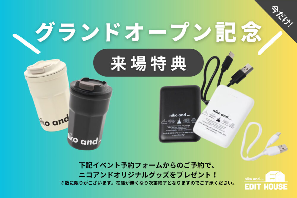 更に今ならグランドオープン記念としてご予約いただいた方に niko and ... のオシャレなグッズをプレゼント!