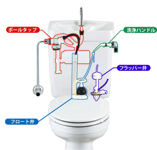 タンク有のトイレの場合はフロート弁などの交換が必要になります。弊社でも承っておりますのでご連絡下さい。使用年数によってはトイレごと交換をお勧め致します。