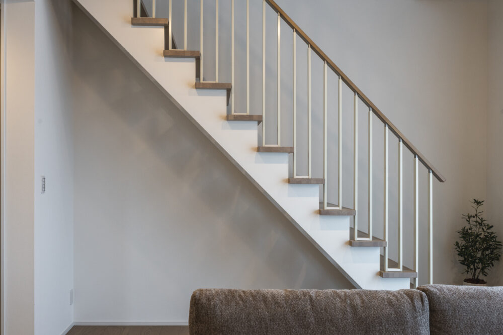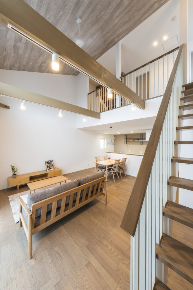 リビング階段なので、家族と何気ない会話が生まれやすく、吹き抜け天井で2階と空間が繋がっているため、プライベートな空間を確保しながらも家族の気配が感じられる作りになっています。 -