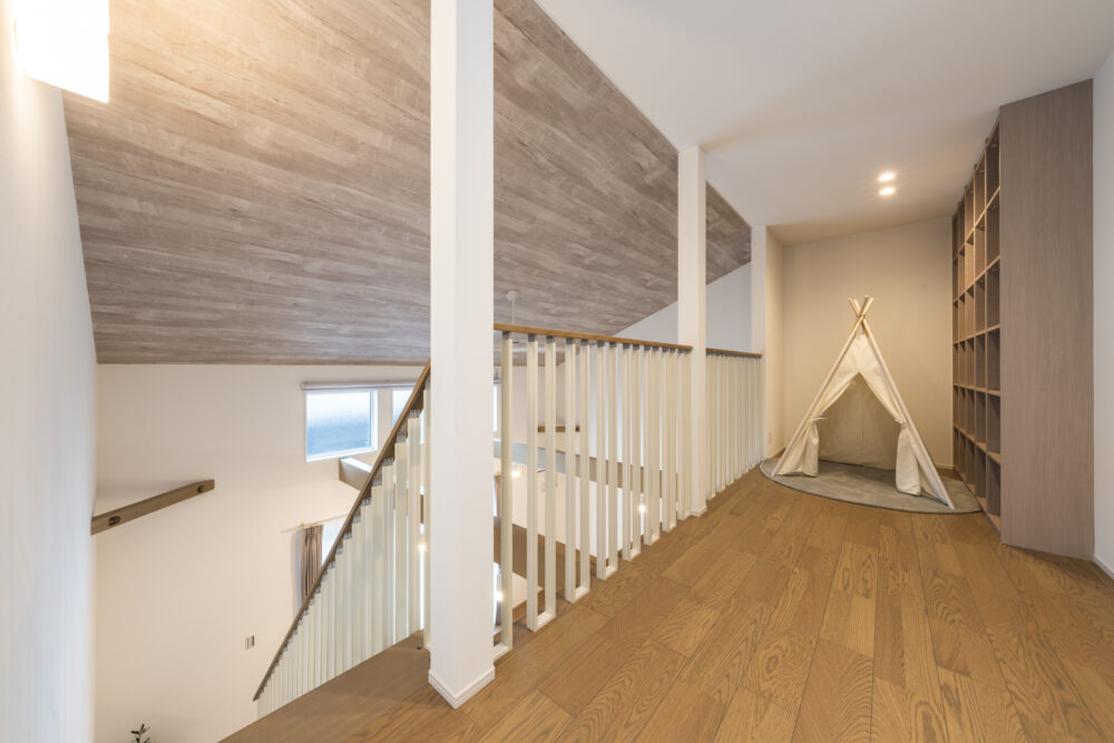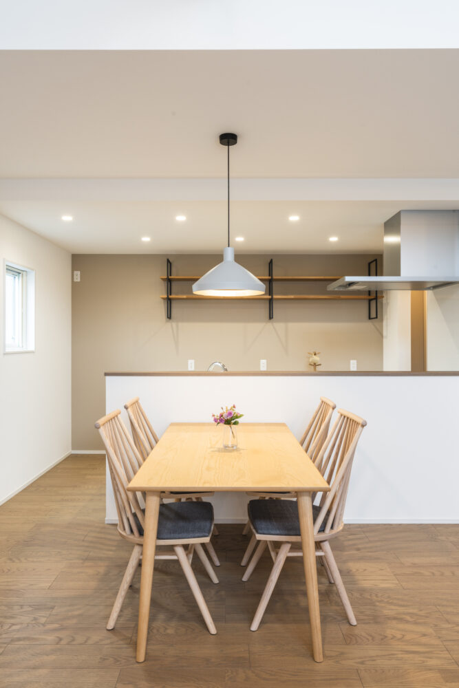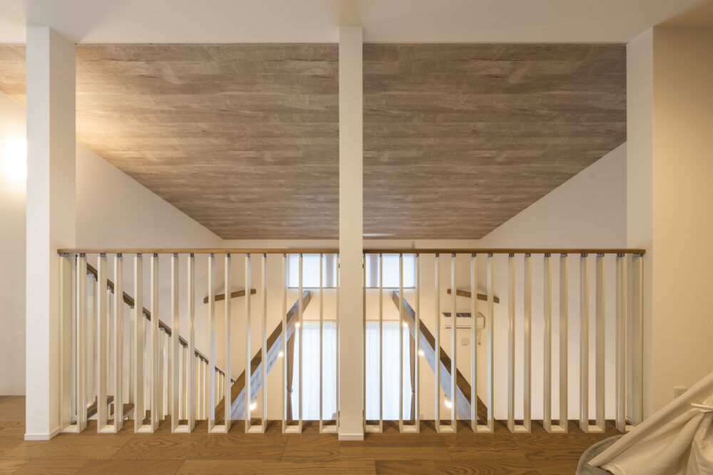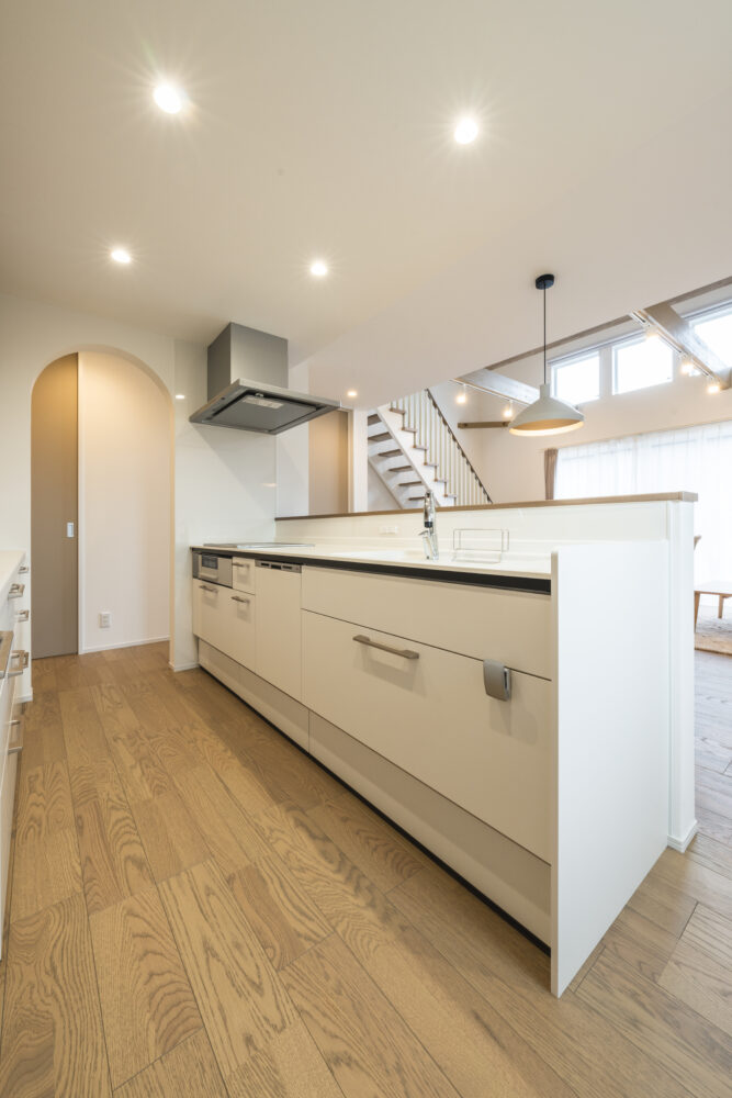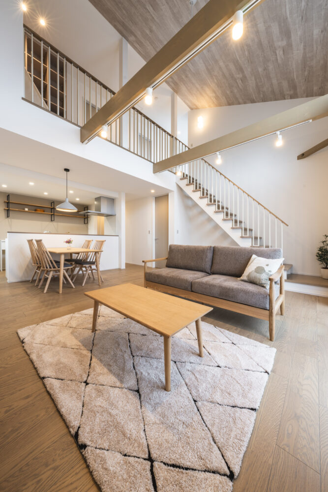 回遊できるキッチンに臨場感ある吹抜の半平屋