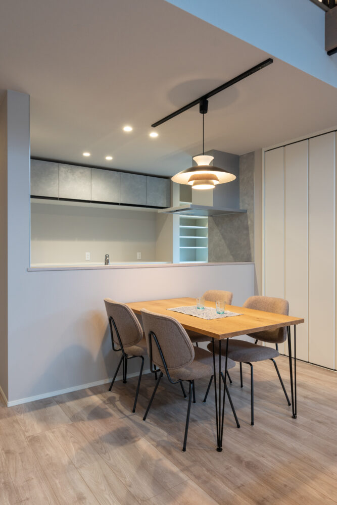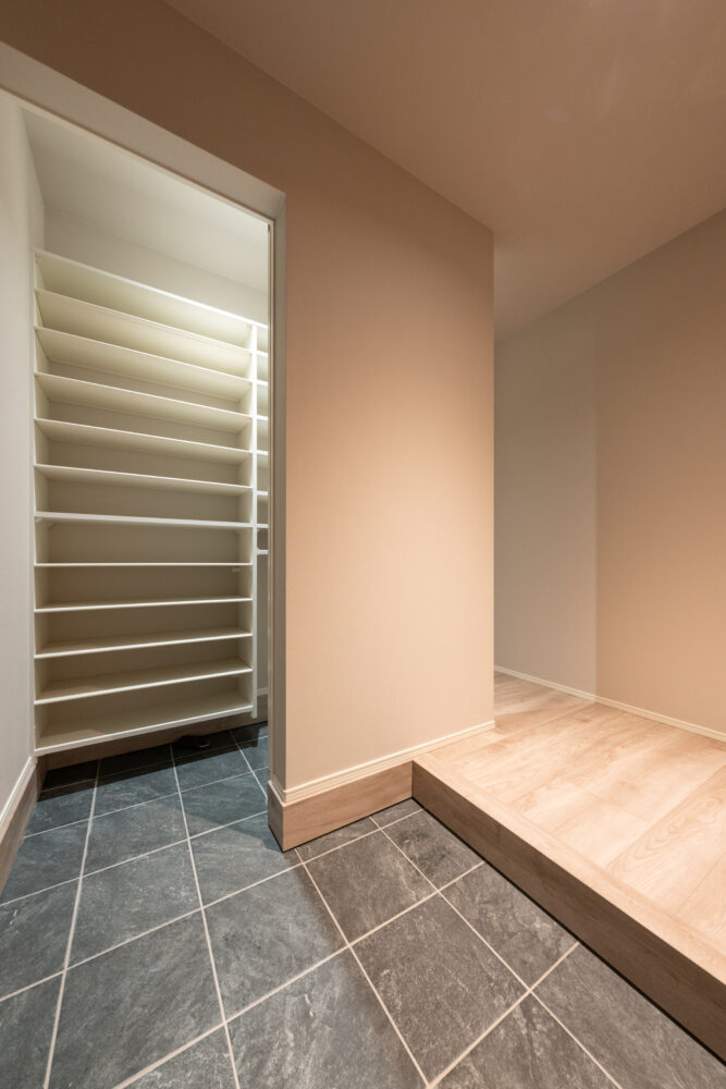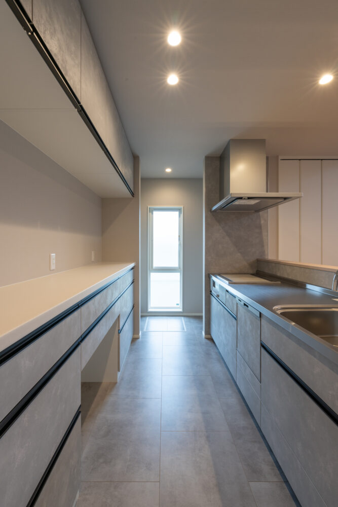 キッチンには冷蔵庫をすっきり隠せるパントリーを隣接し、生活感を抑えた美しい空間に。