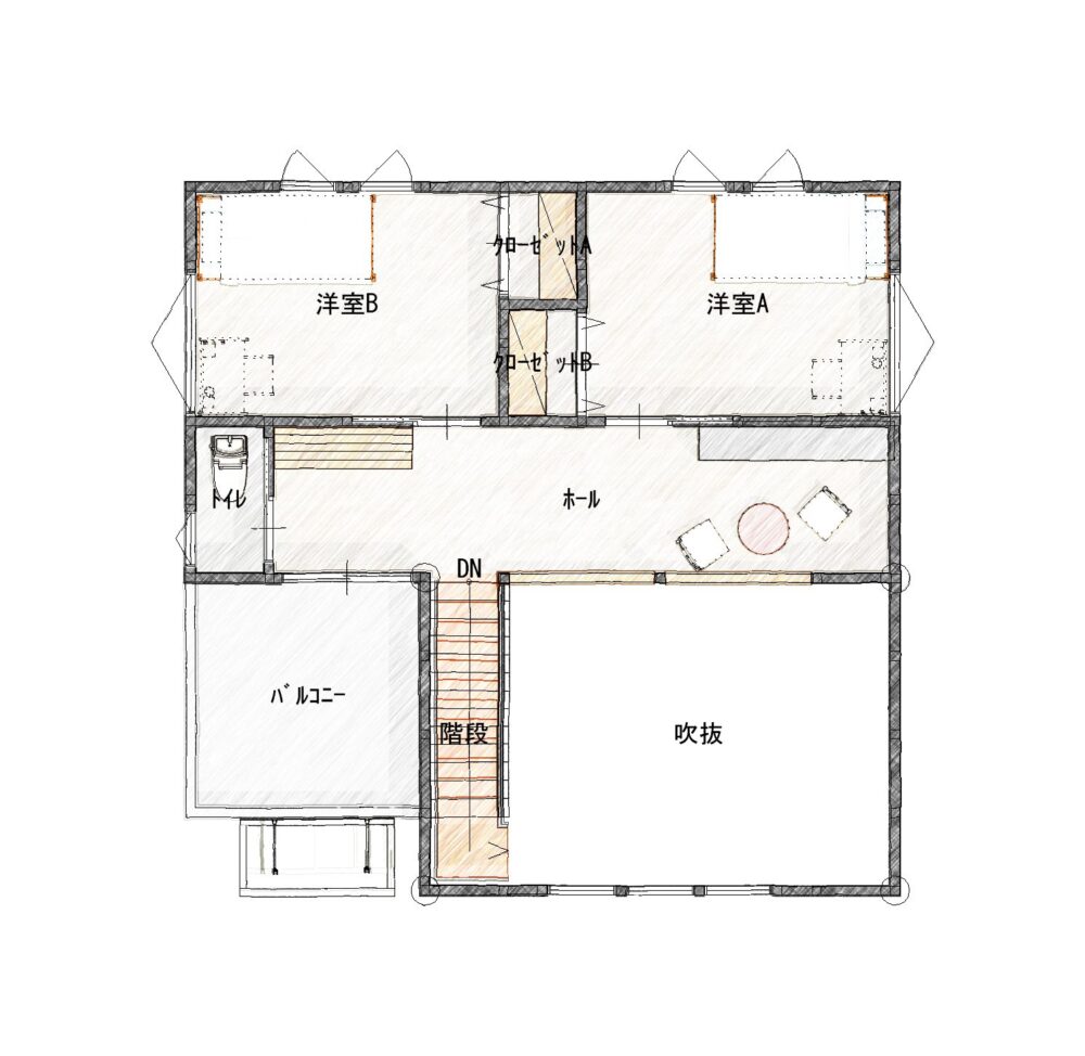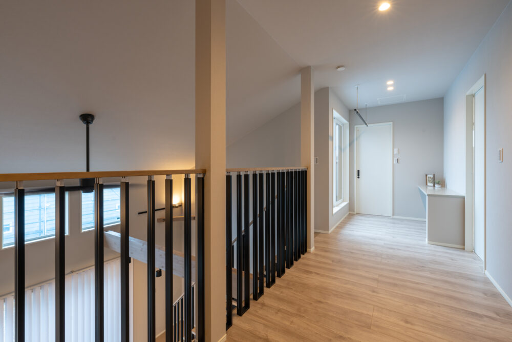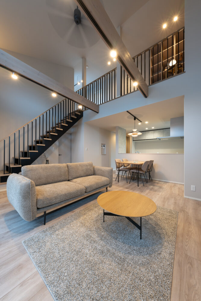 吹抜けのあるリビングは、開放感と光に満ちた心地よい場所。