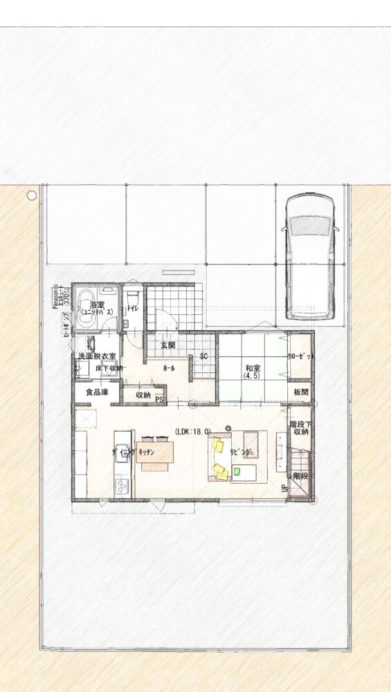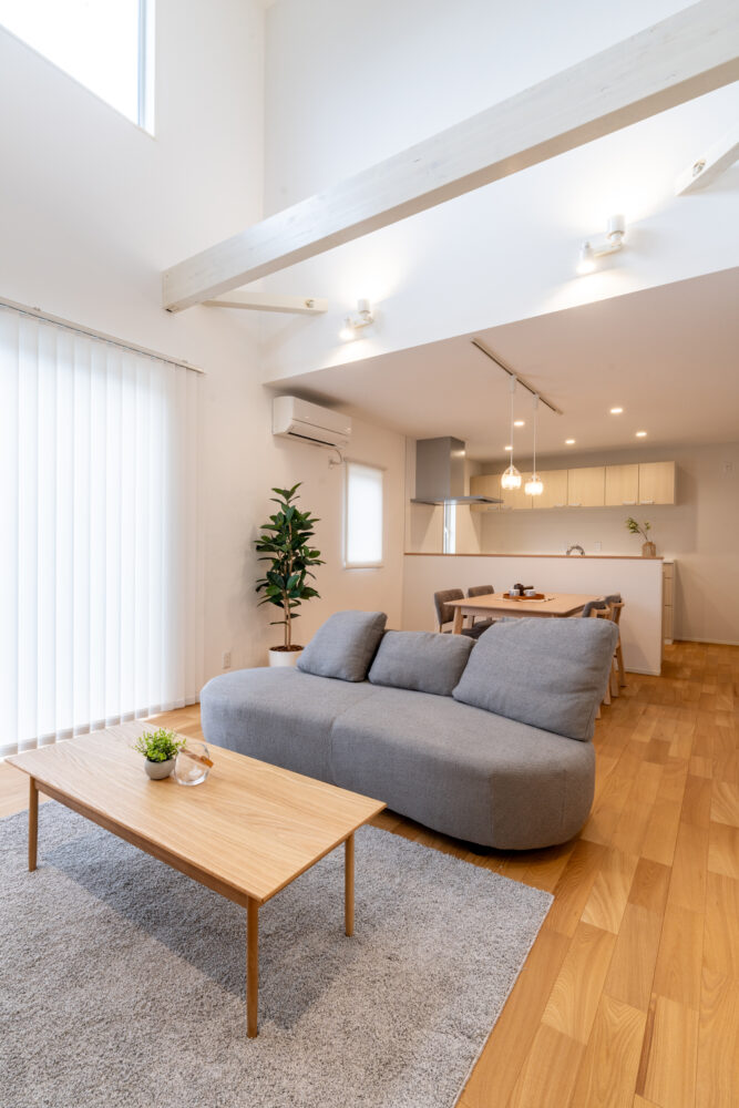 室内は、明るい吹抜けリビングを中心に、ナチュラルな木目がやさしく広がります。
