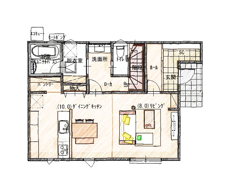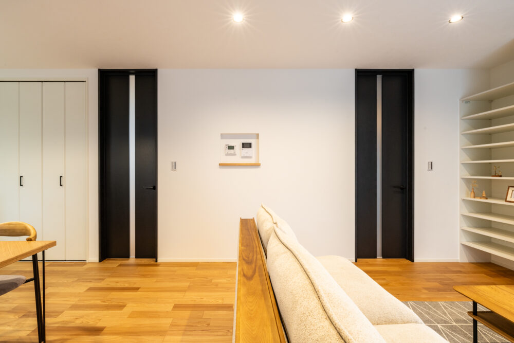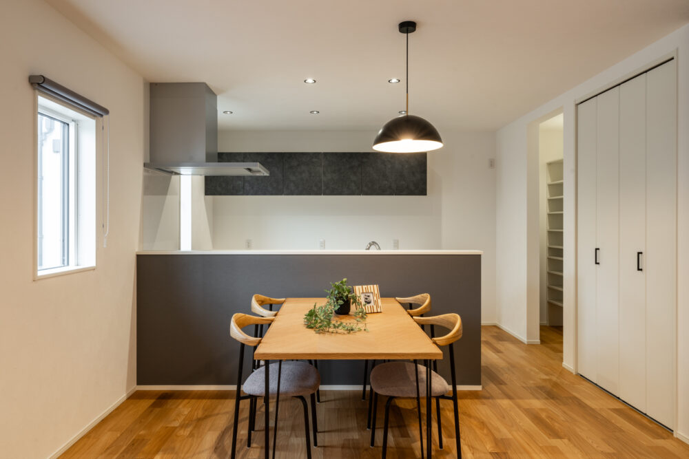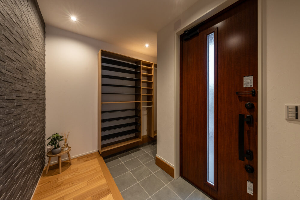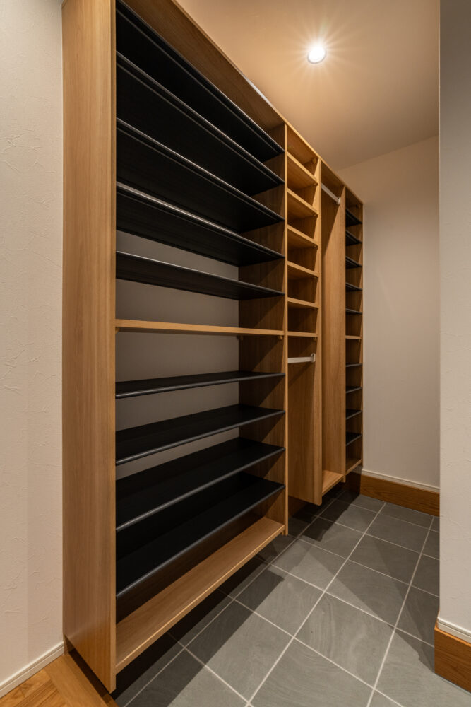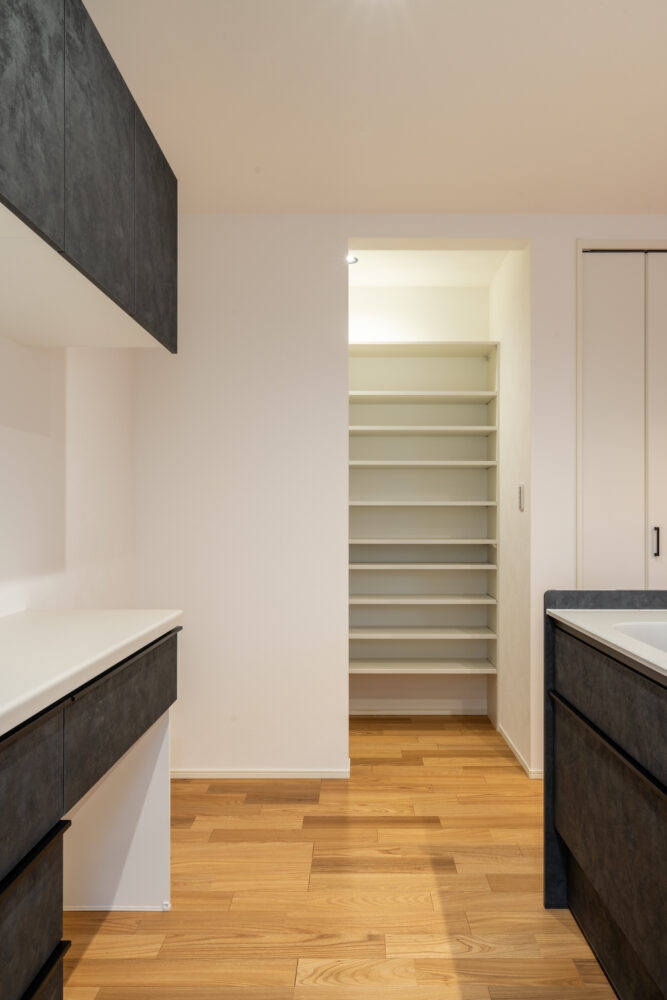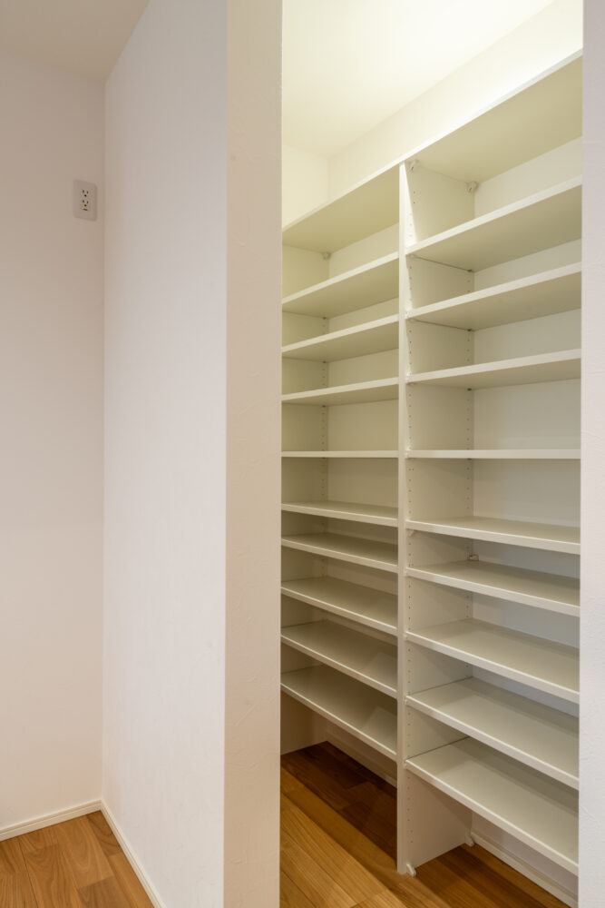 玄関のシューズクローゼット、ダイニング横の物入、キッチンのパントリーなど、使いやすい場所に必要な収納を。