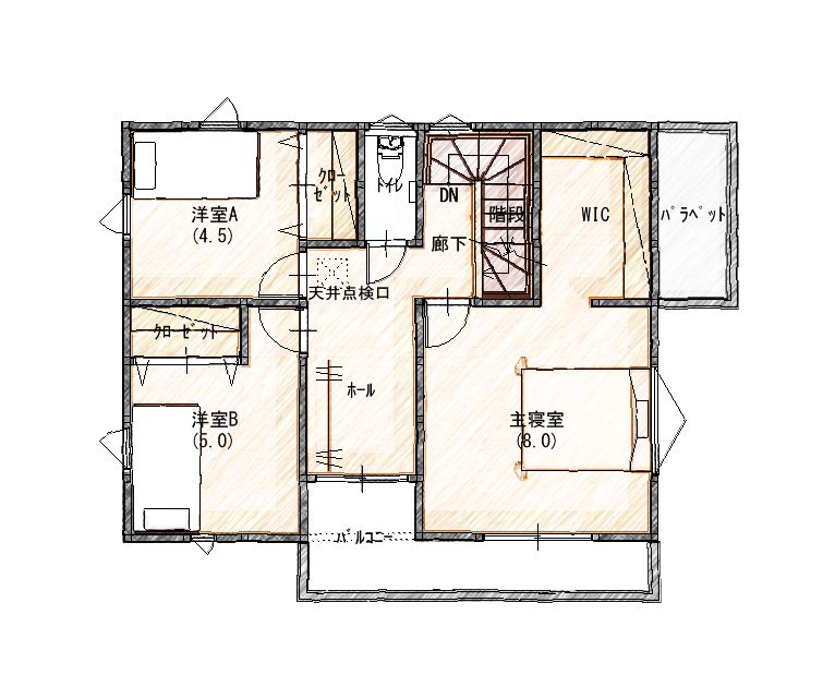 2階には3部屋と、ホールから直接出られるバルコニー。