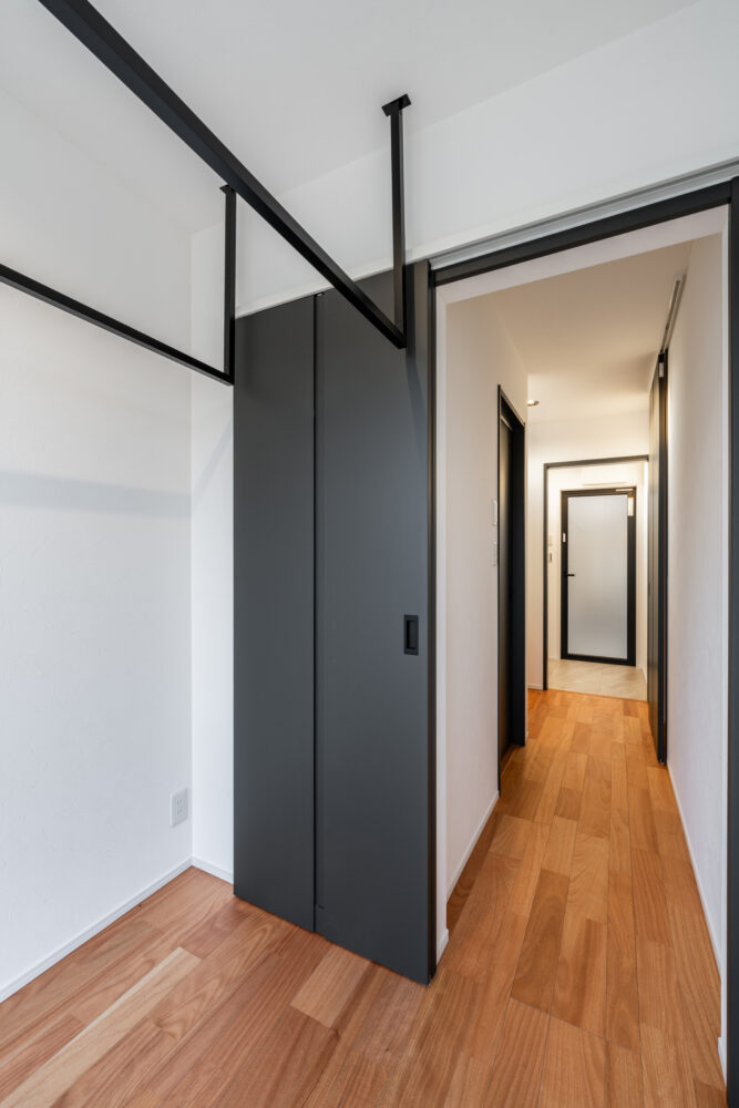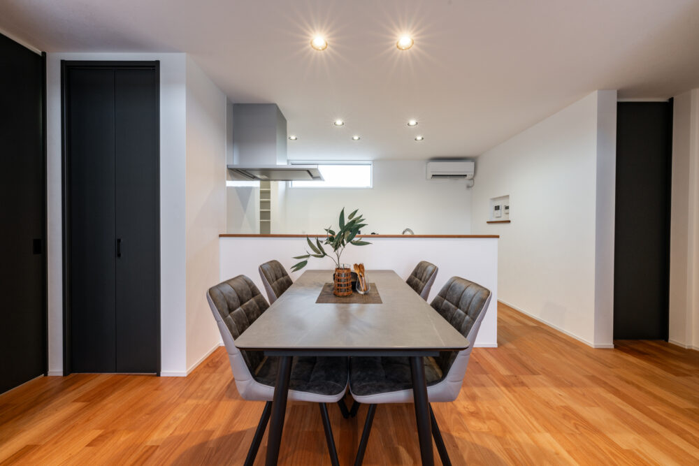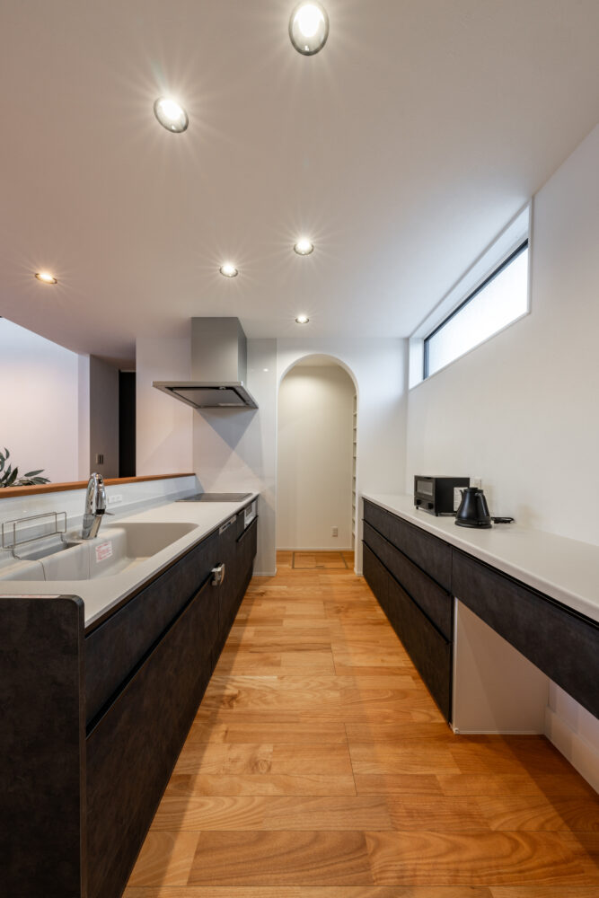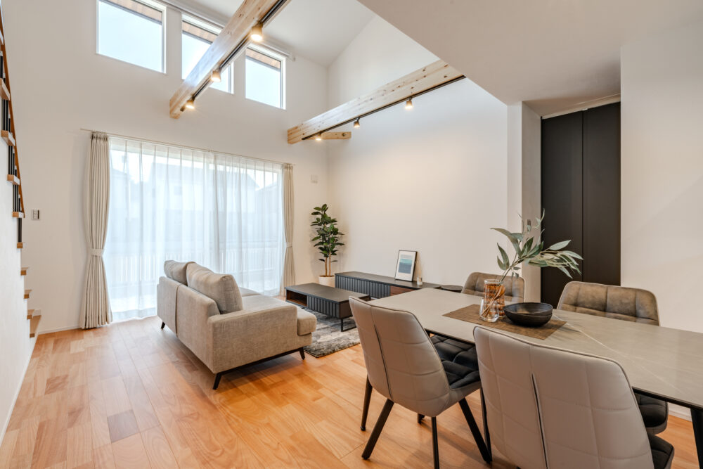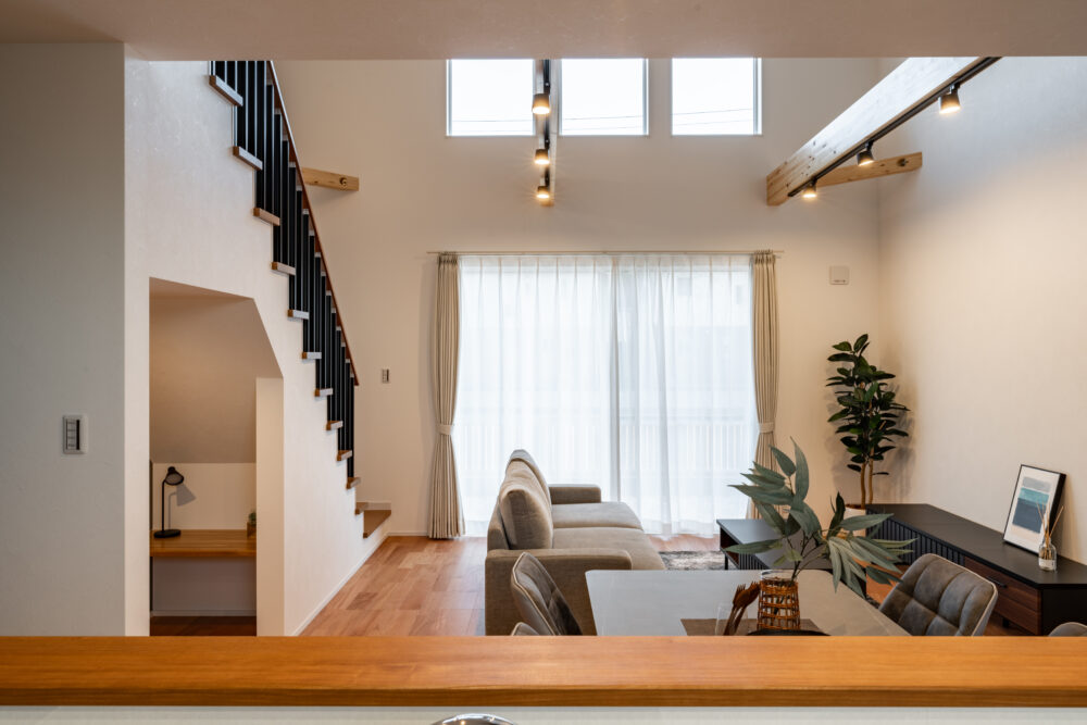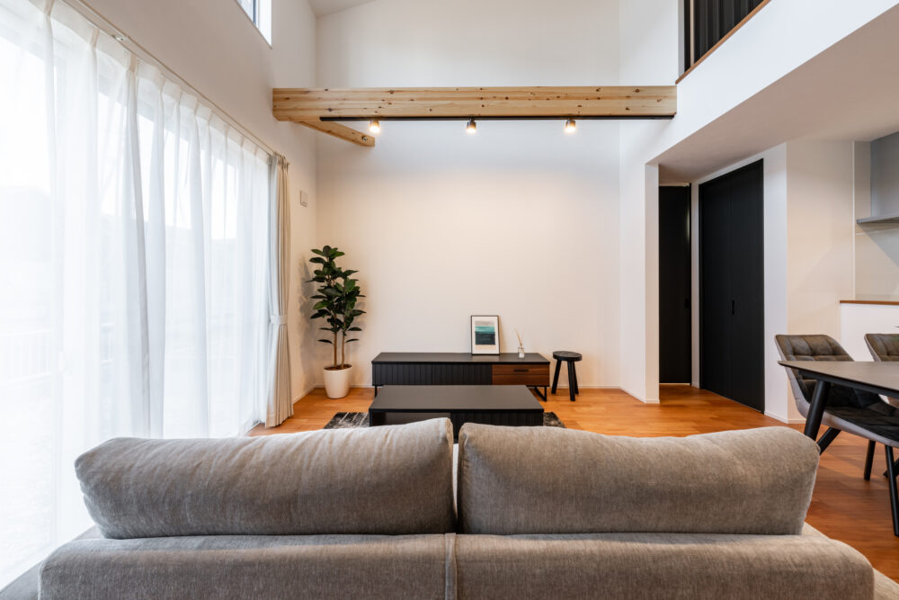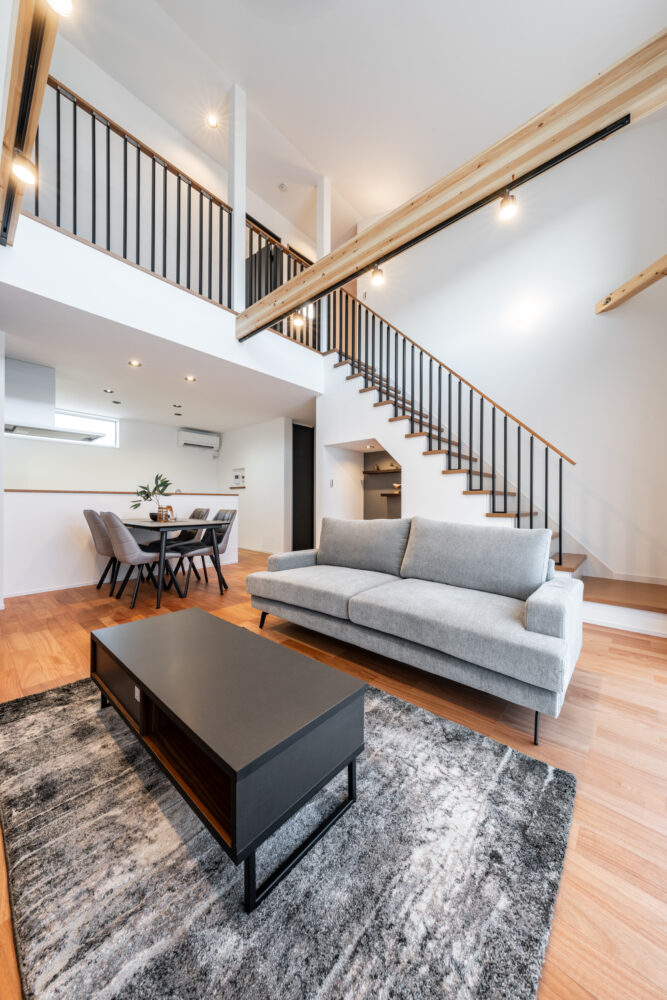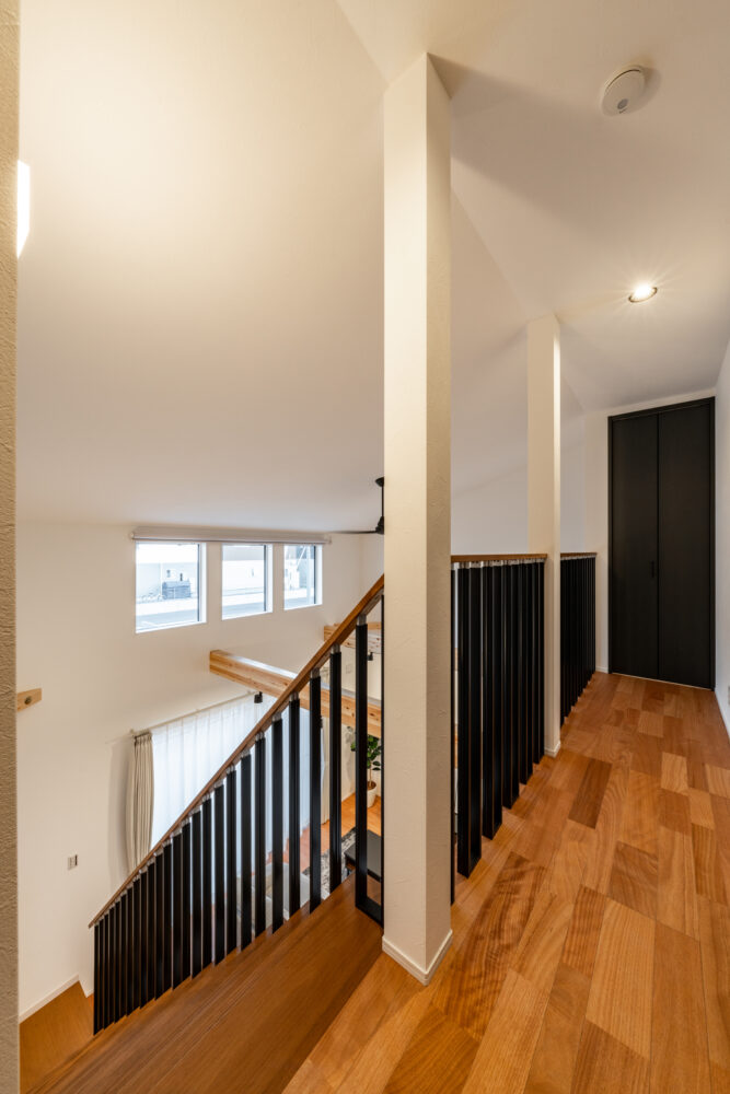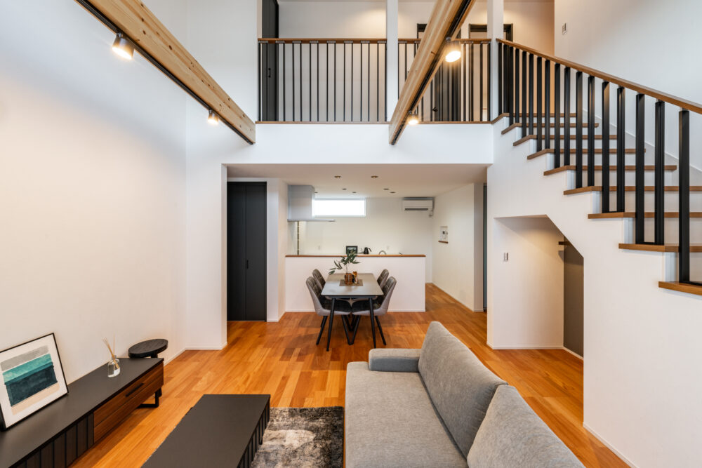 黒と木目が調和する空間に、吹抜けと勾配天井が開放感を演出。