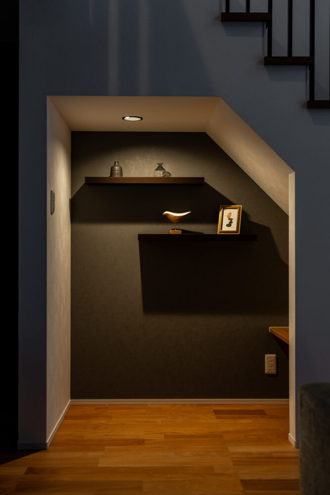 階段下にはスタディスペースを設け、暮らしに+αの工夫を。