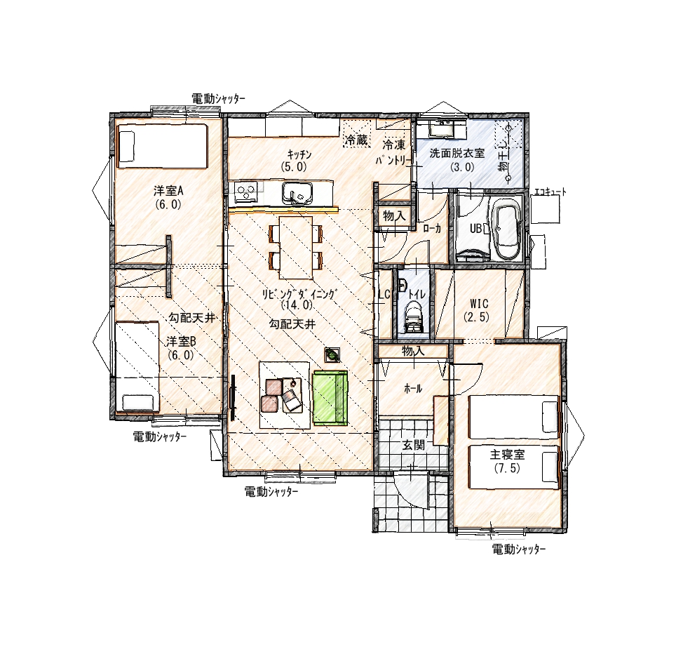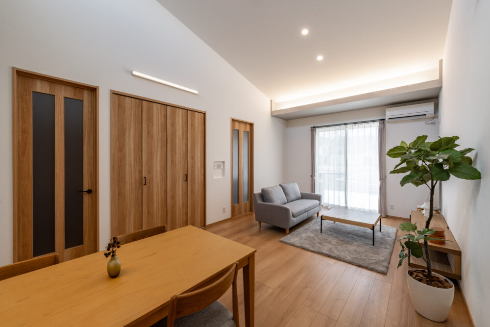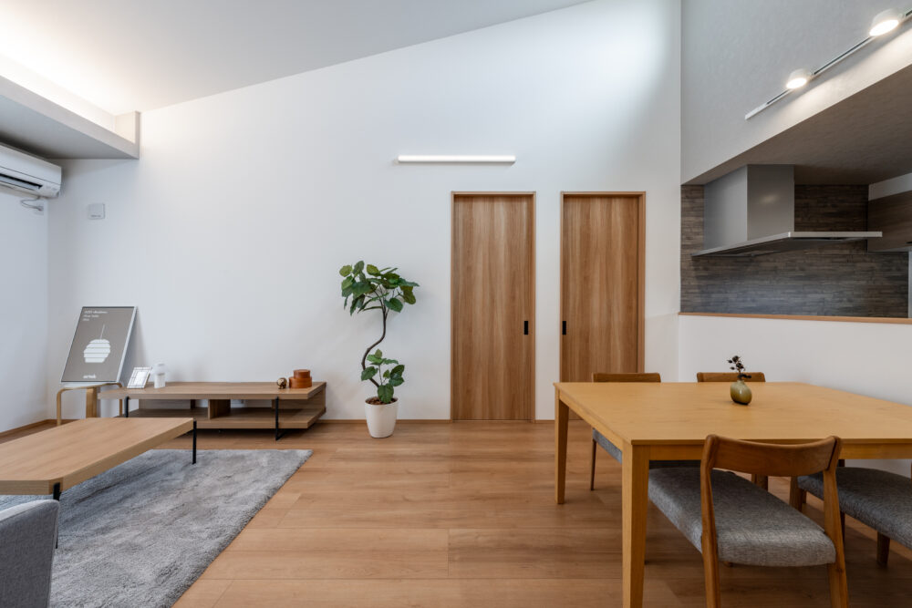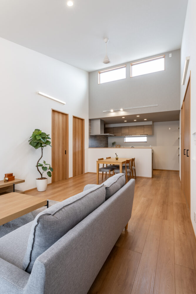 勾配天井のリビングダイニングに、南側上部からやさしく光る間接照明が、空間を上質に演出。