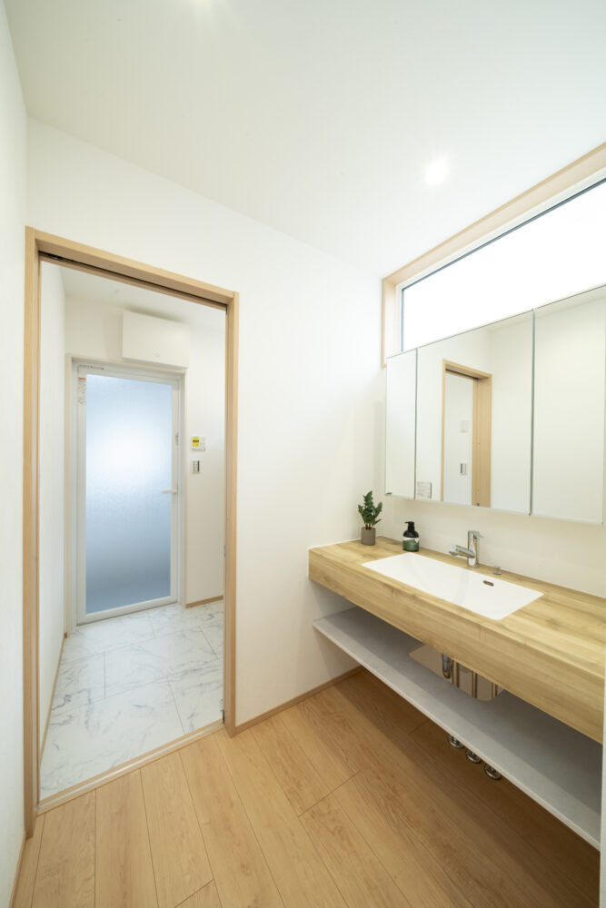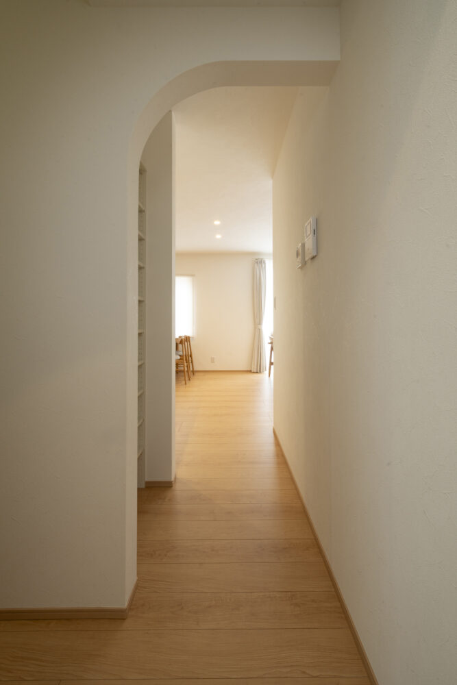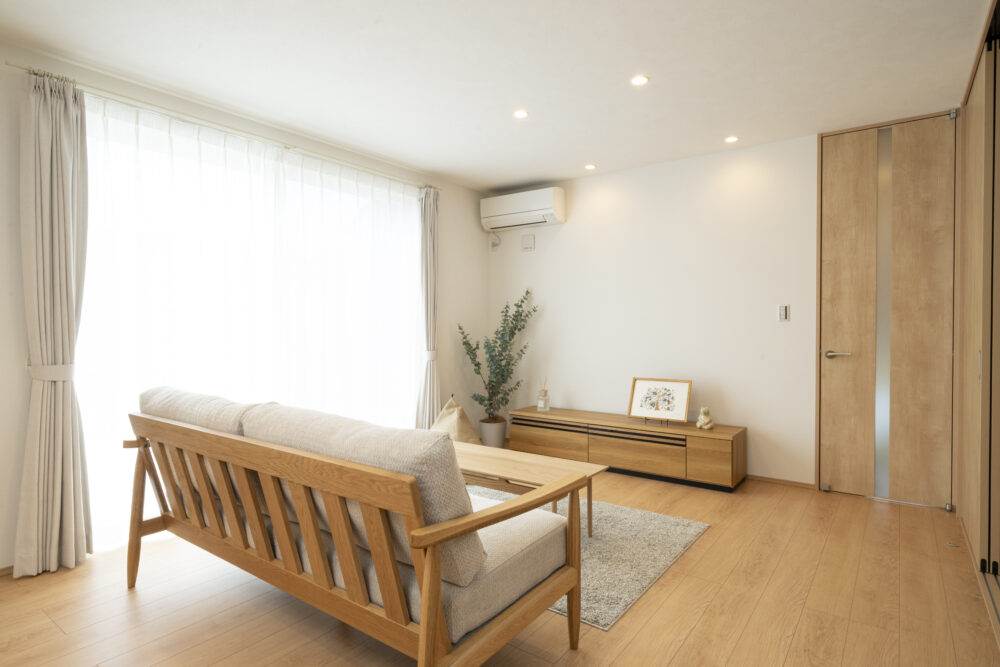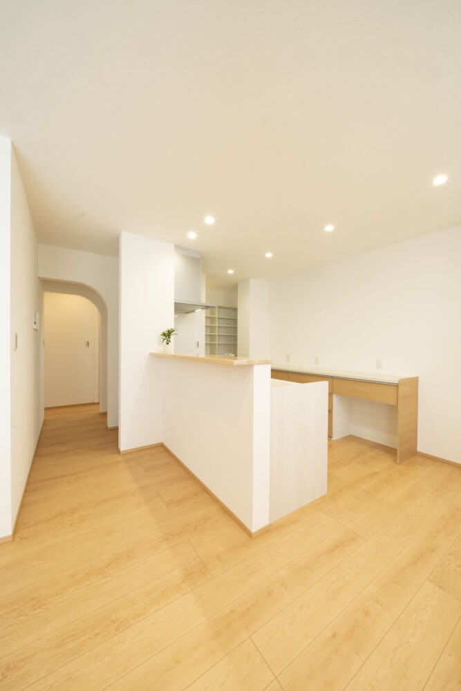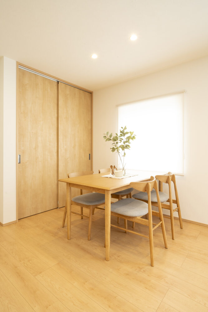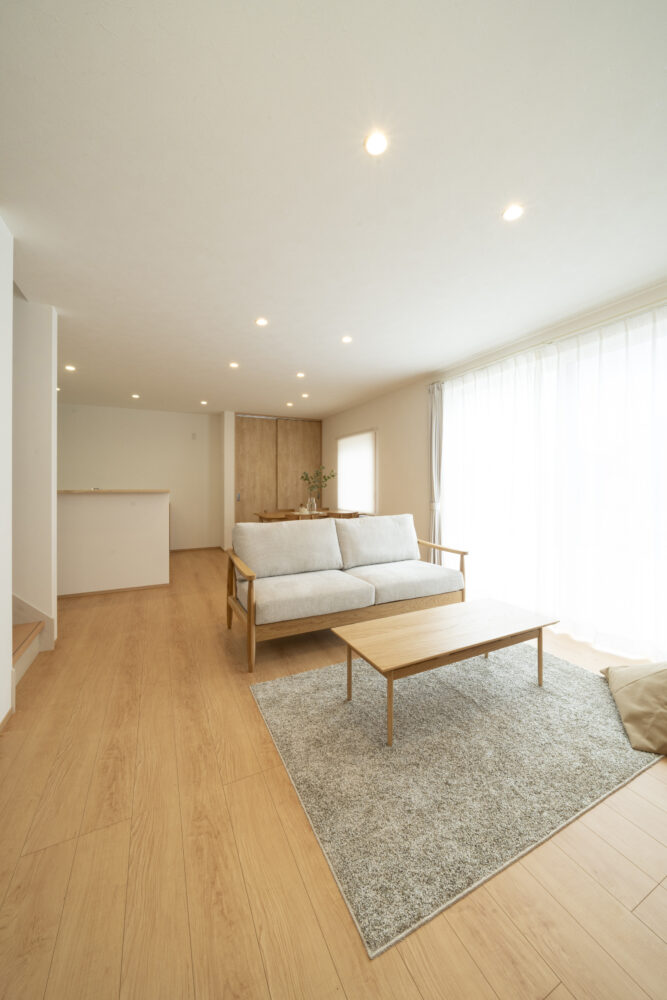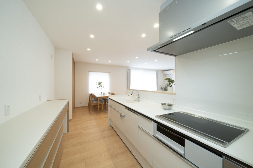 キッチンからダイニングへ、そしてリビングへと自然に繋がる動線で、家事をしながらでも家族との会話を楽しめます。