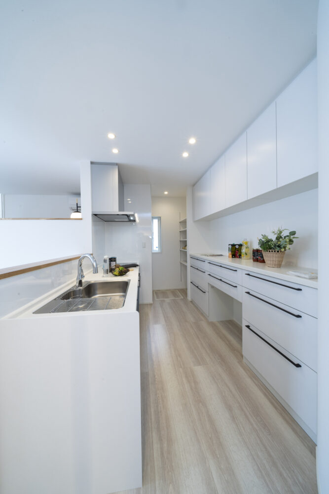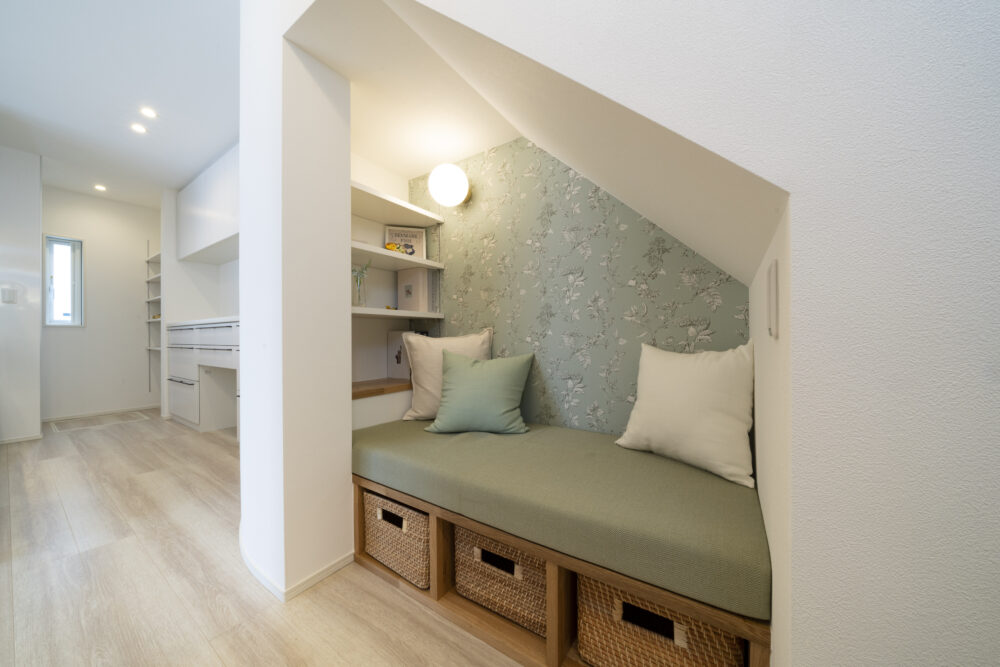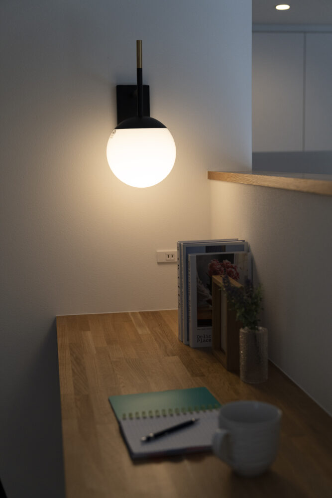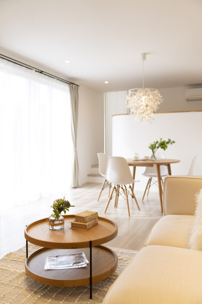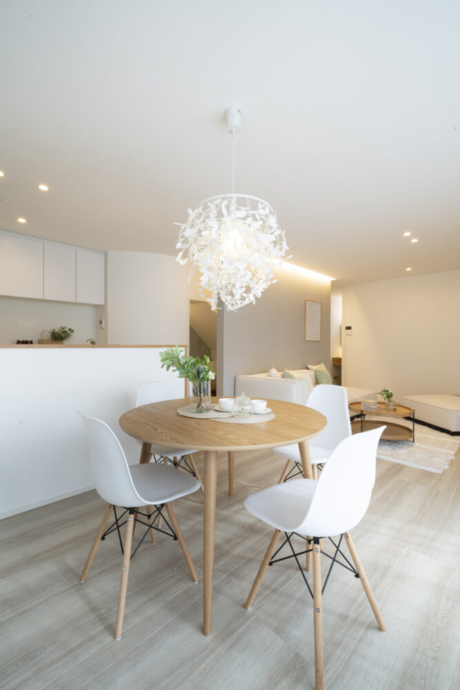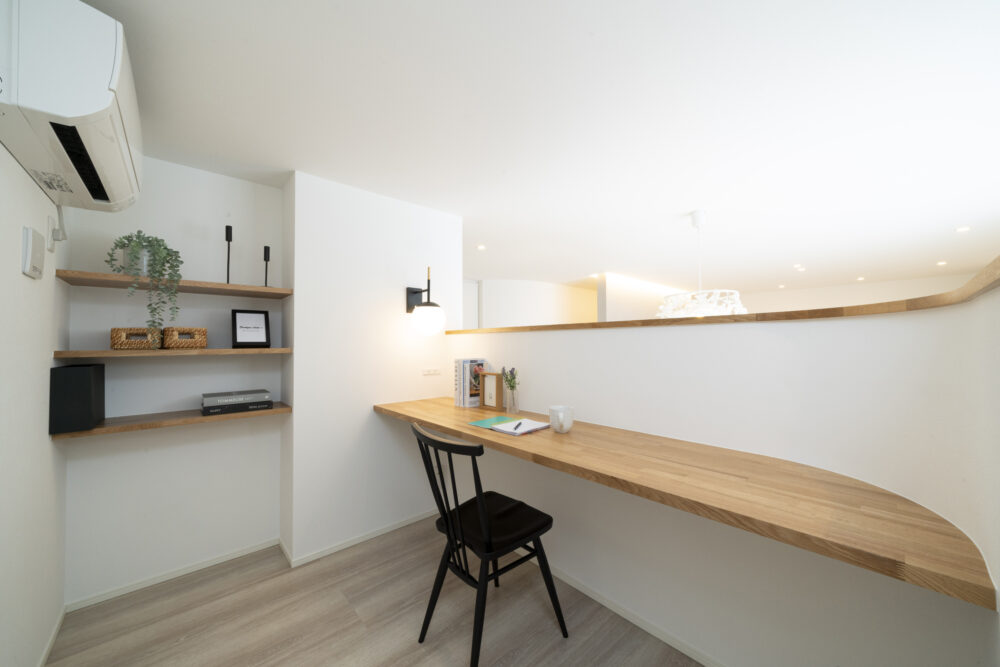 白と木目を基調とした、ナチュラルシックなお家です。ダイニングの先にあるスタディースペースは、家族と同じ空間にいながらも集中して作業ができるちょうどいい距離感の空間。インテリアコーディネーターの荒井詩万先生によるこだわりの家具雑貨も見どころです。