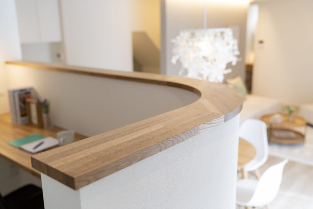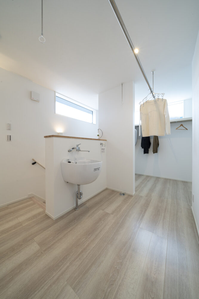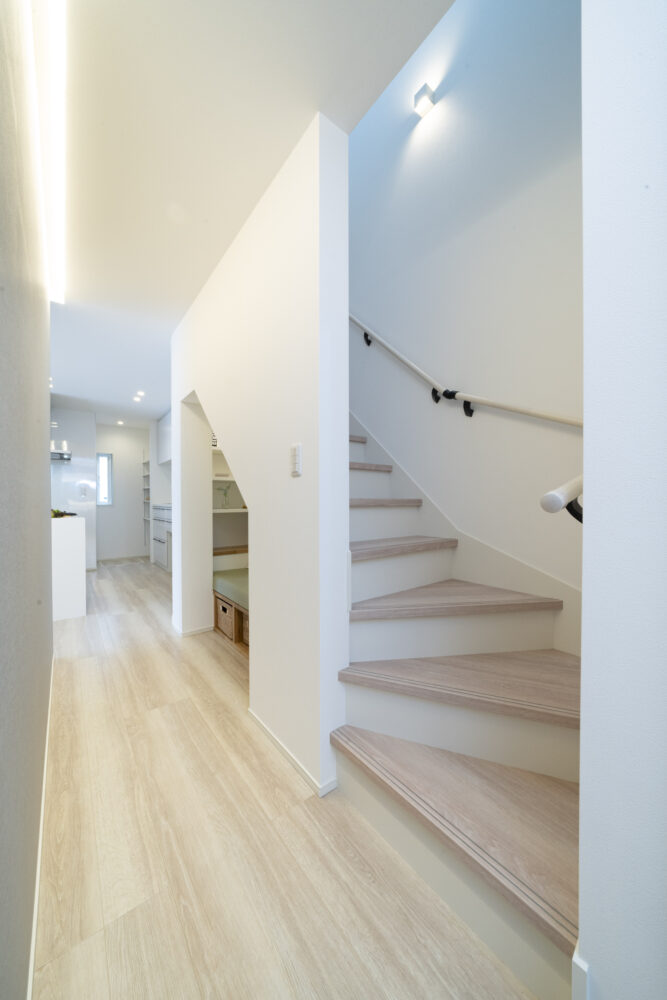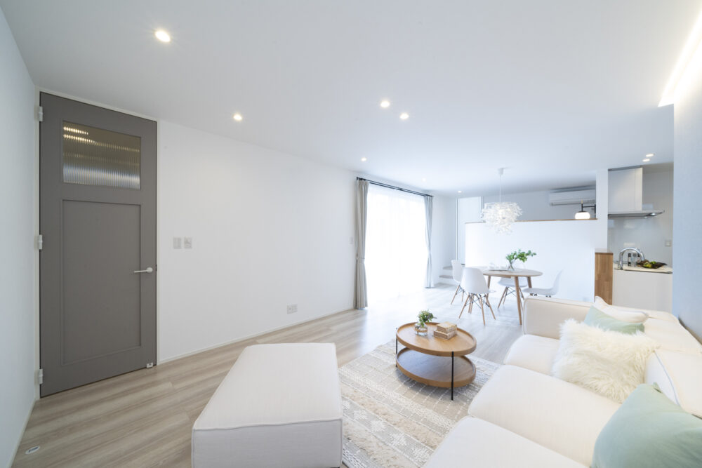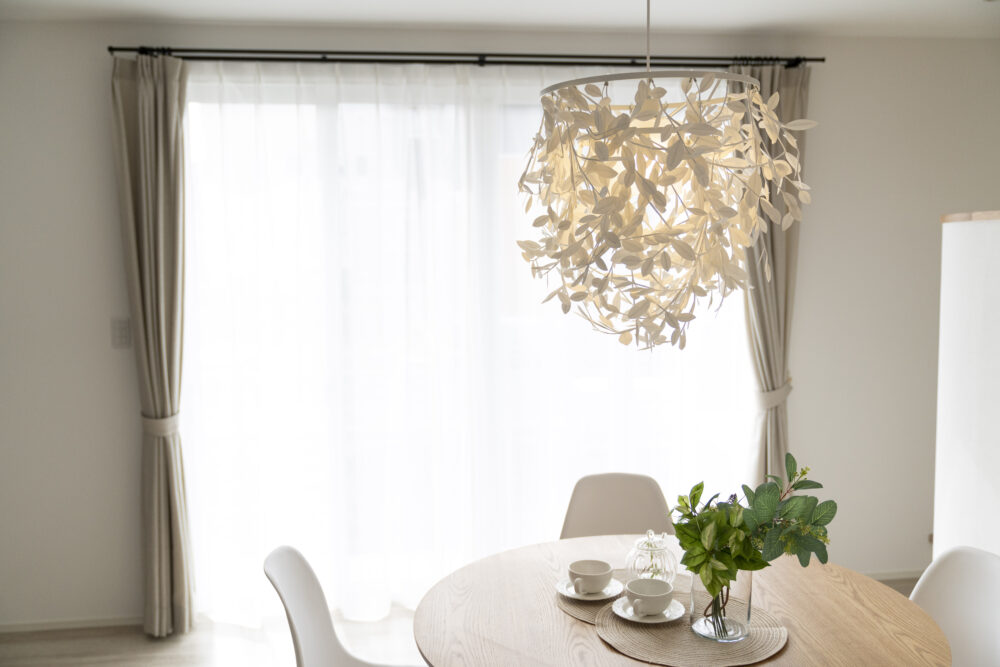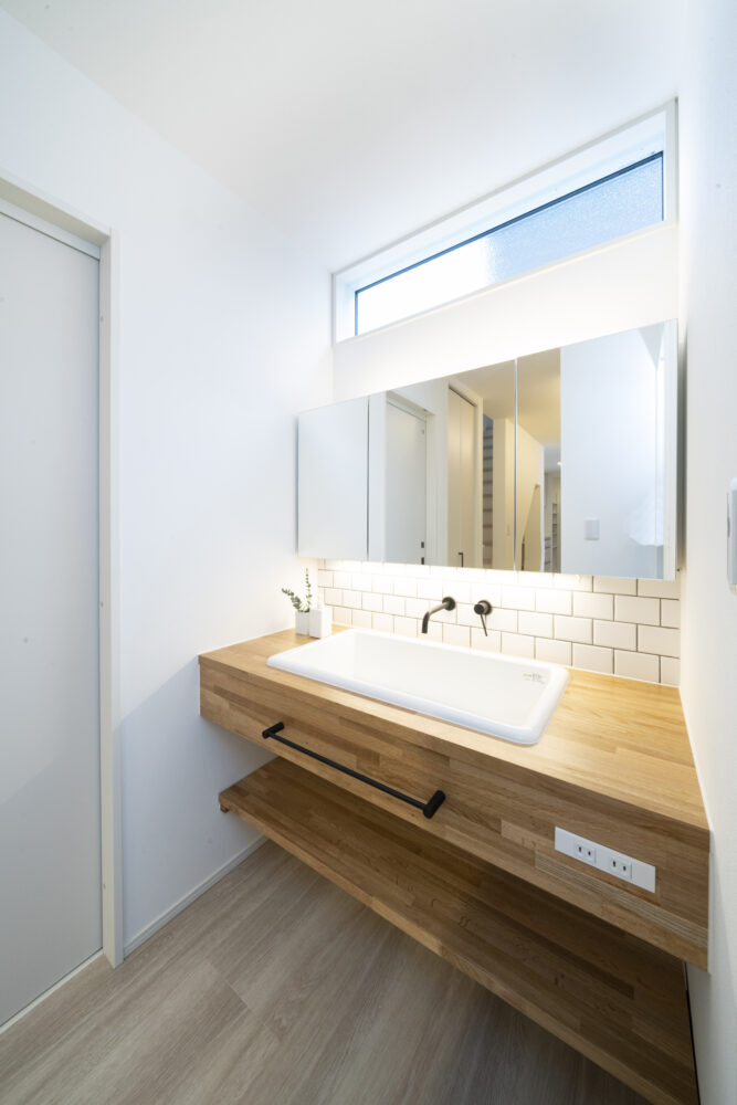 白と木目を基調とした、ナチュラルシックなお家です。ダイニングの先にあるスタディースペースは、家族と同じ空間にいながらも集中して作業ができるちょうどいい距離感の空間。インテリアコーディネーターの荒井詩万先生によるこだわりの家具雑貨も見どころです。