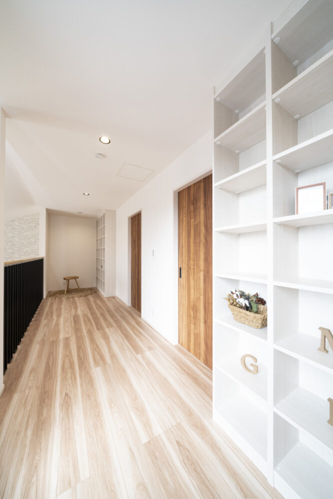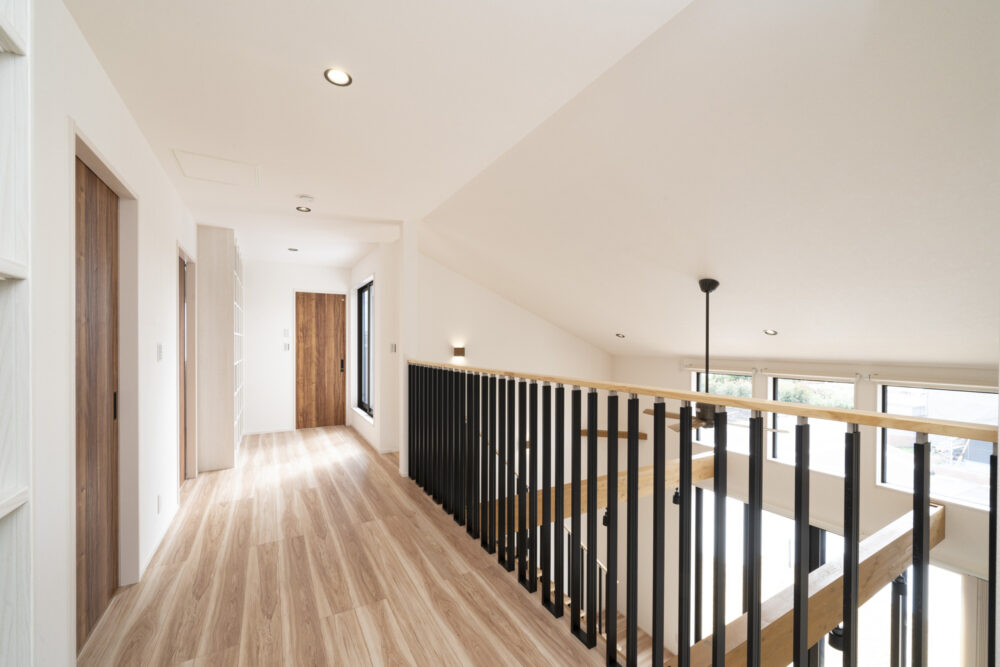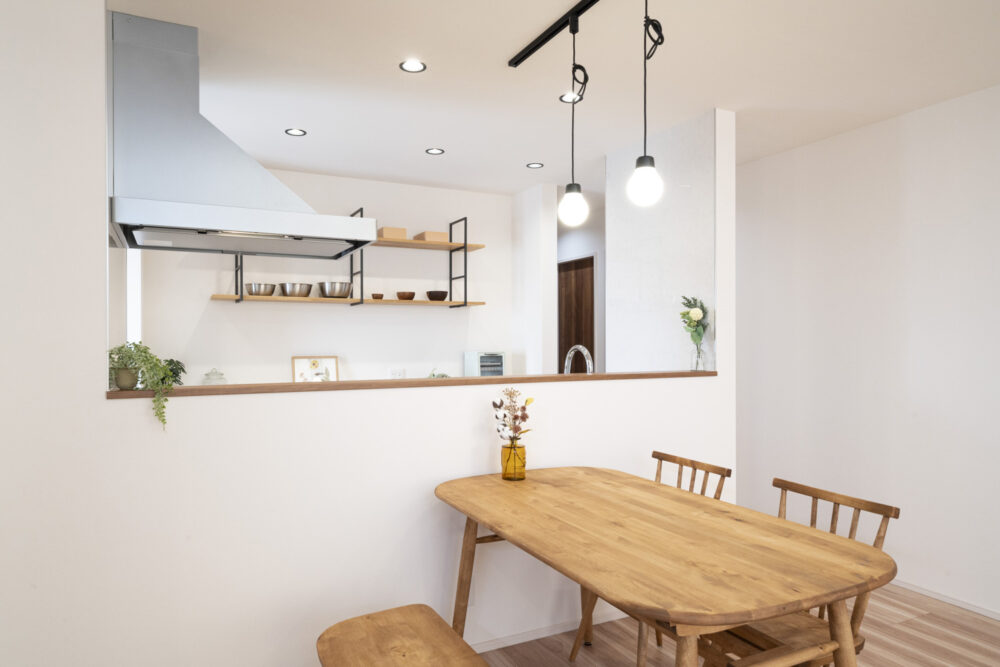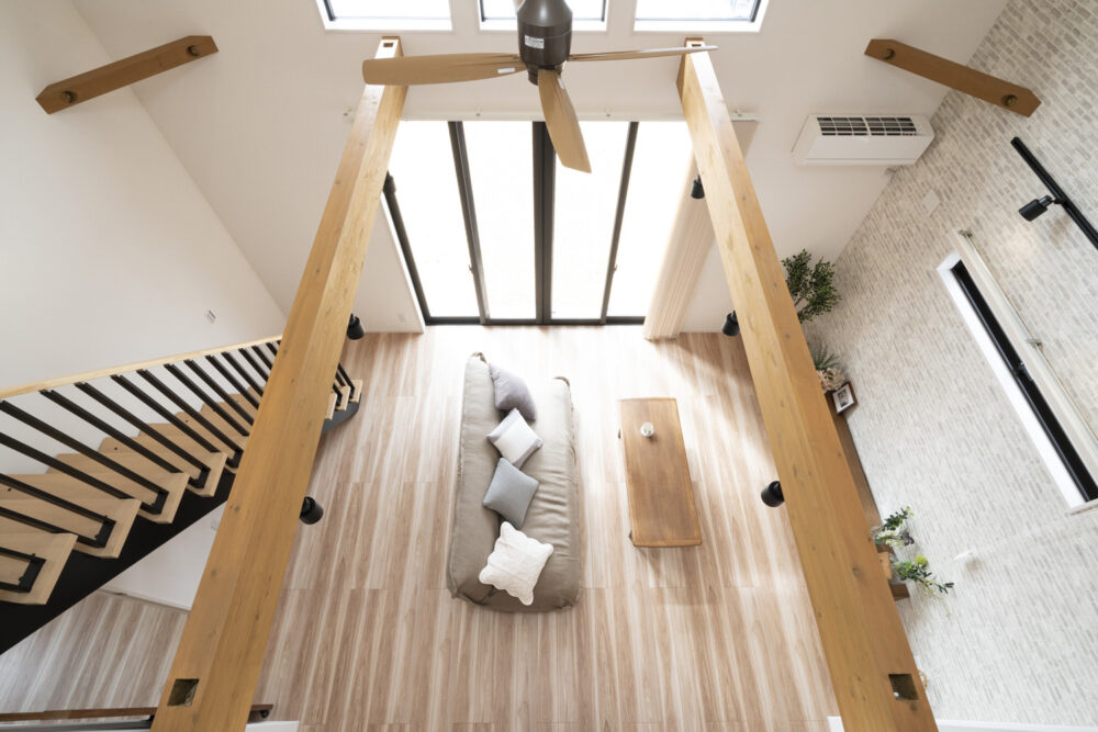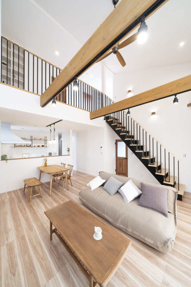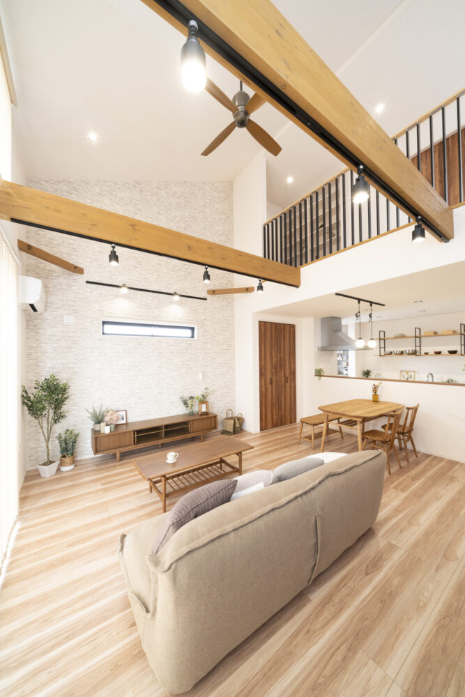"Piatta(ピアッタ)"モデルハウスとして建てられた半平屋の家。LDKが1直線になっており、キッチンで家事をしていてもリビングを見渡すことができます。リビング上部が吹き抜けになっており、解放感も抜群。
