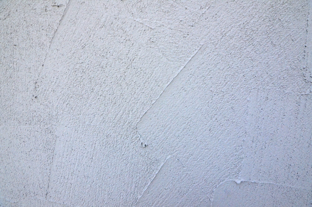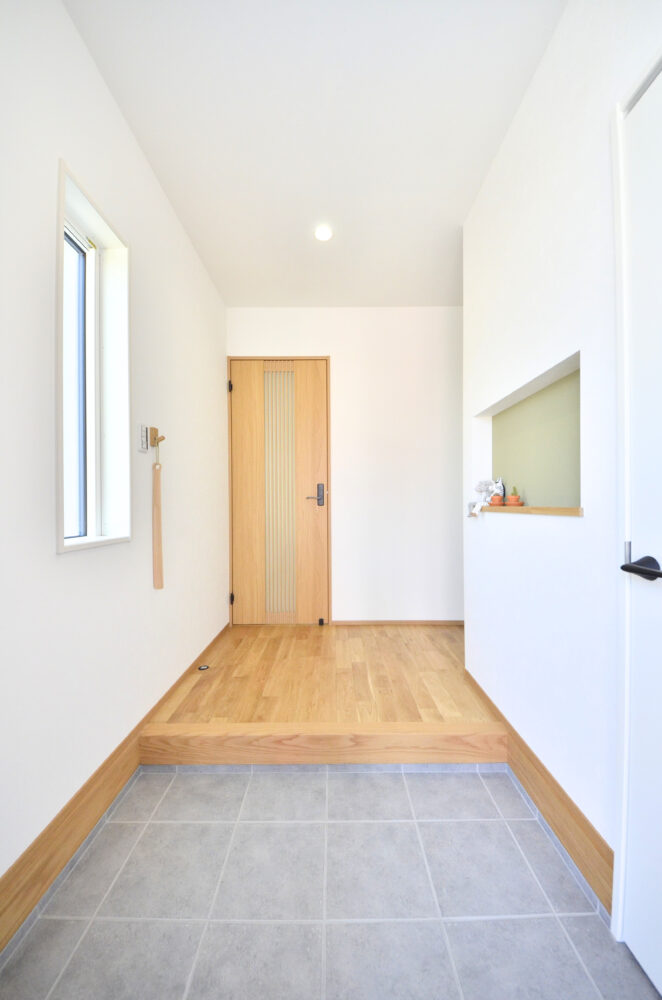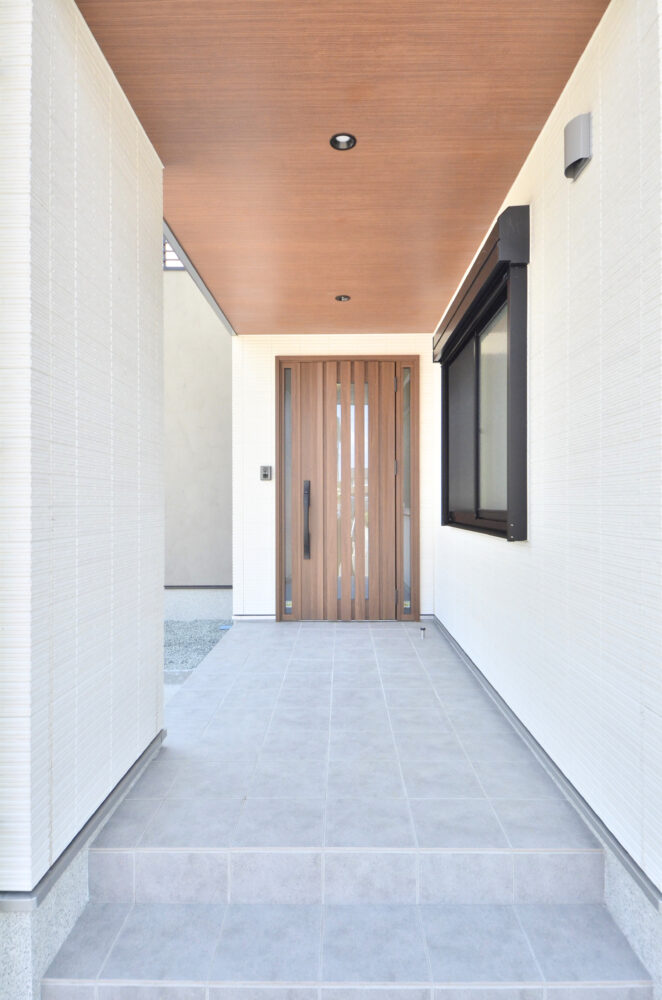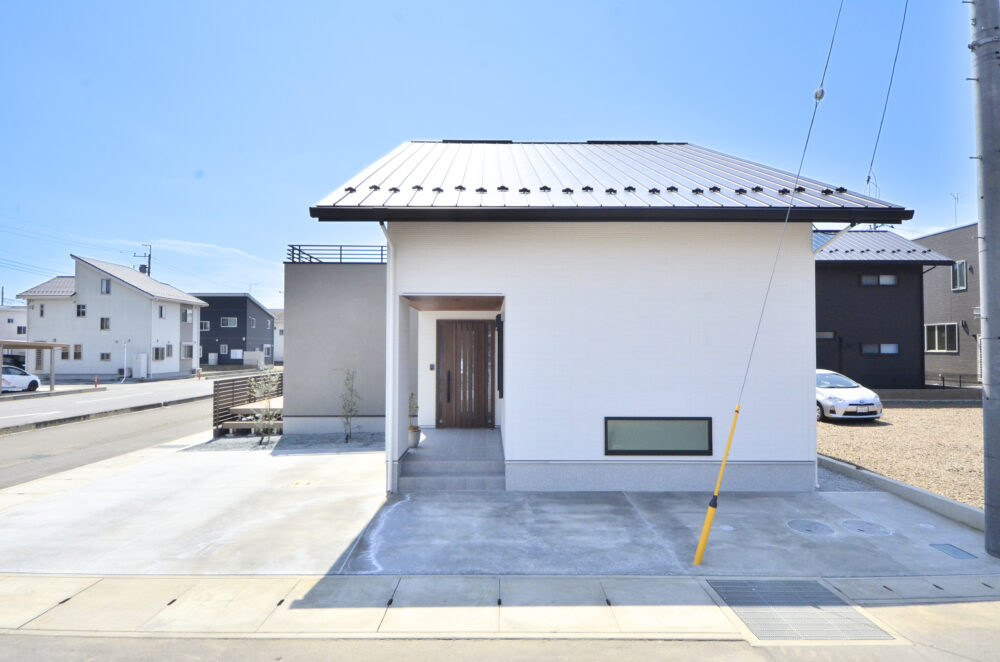 大きな三角屋根が印象的な半平屋の戸建て。一階のリビング部分が突き出ており、塗り壁の外壁がアクセントになっています。