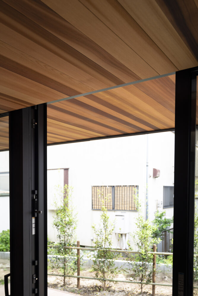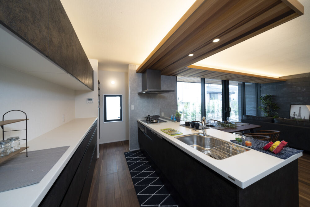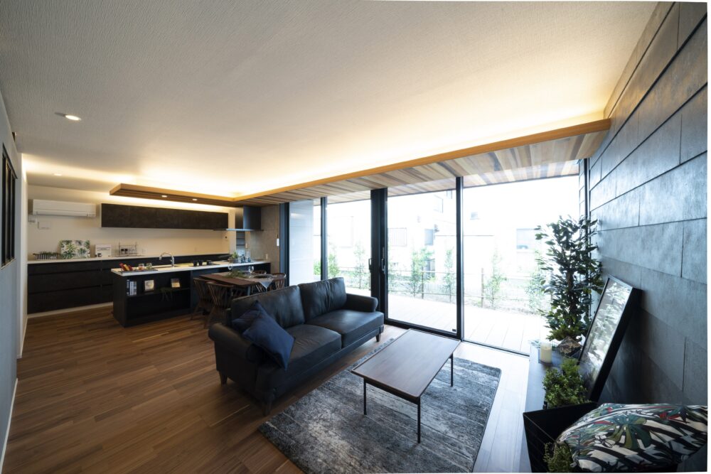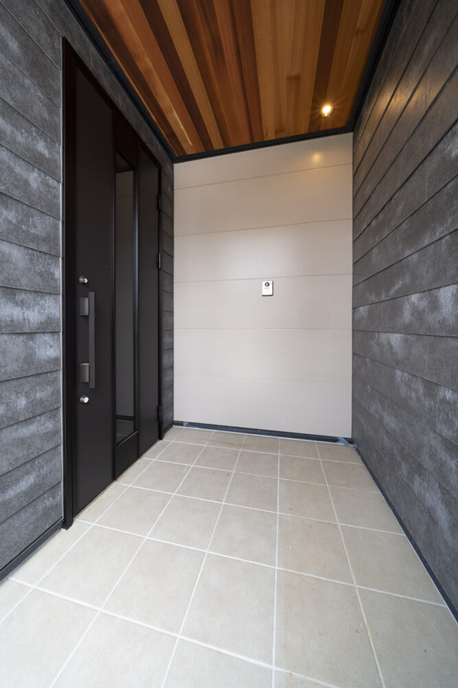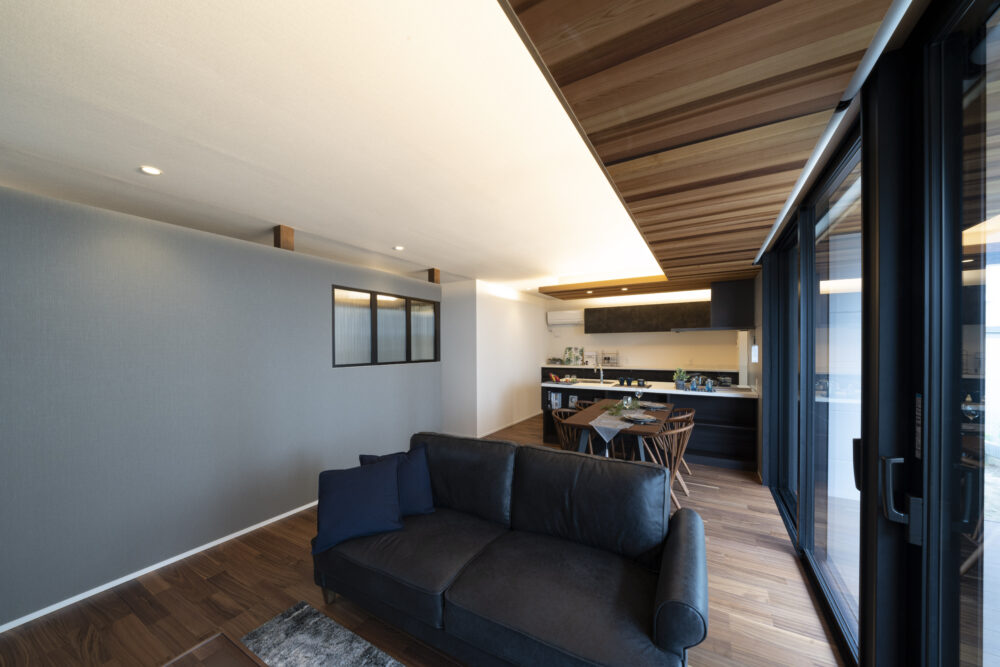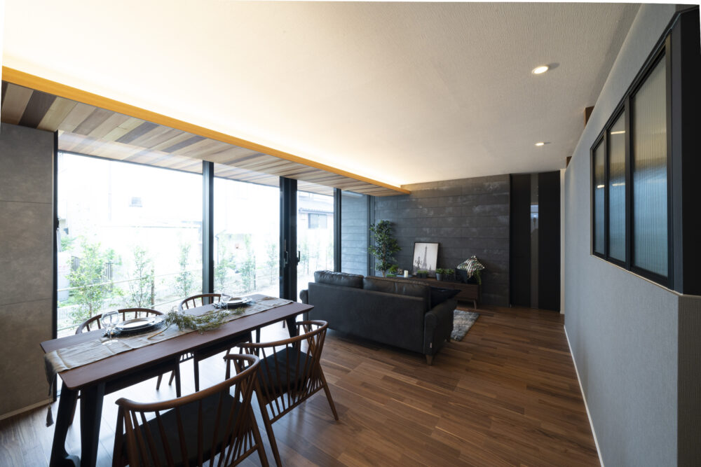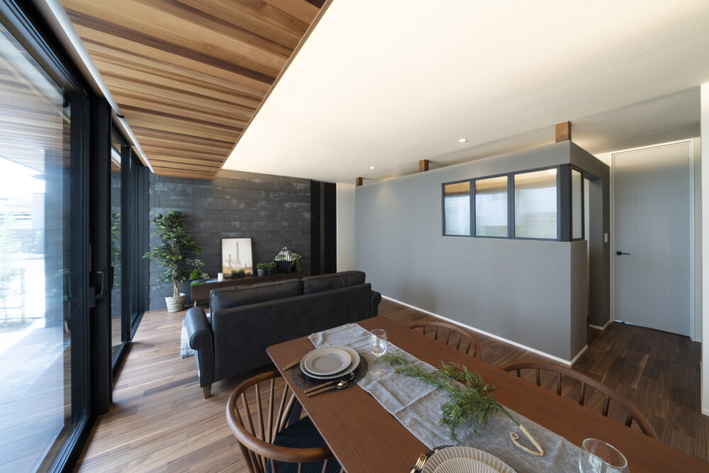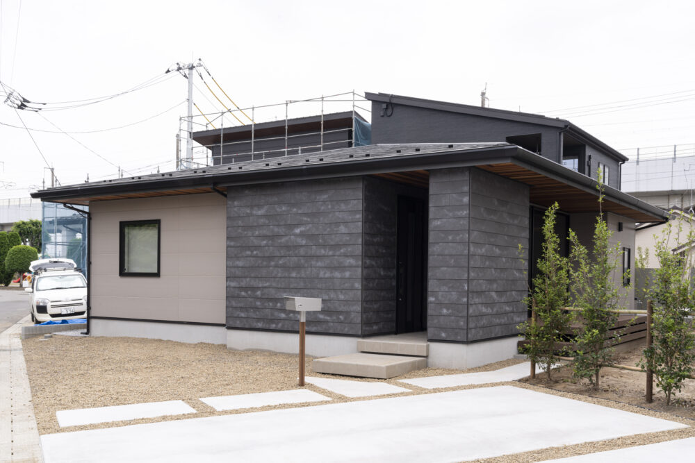 むぎくらのモデルハウスとして建てられた平屋です。建物は25坪で2LDKとコンパクトでありながらも、思わず目が引かれてしまうような存在感のある外観。リビング正面の壁はクロスではなく外壁が続いており、凹凸があるので光の陰影がとても綺麗。