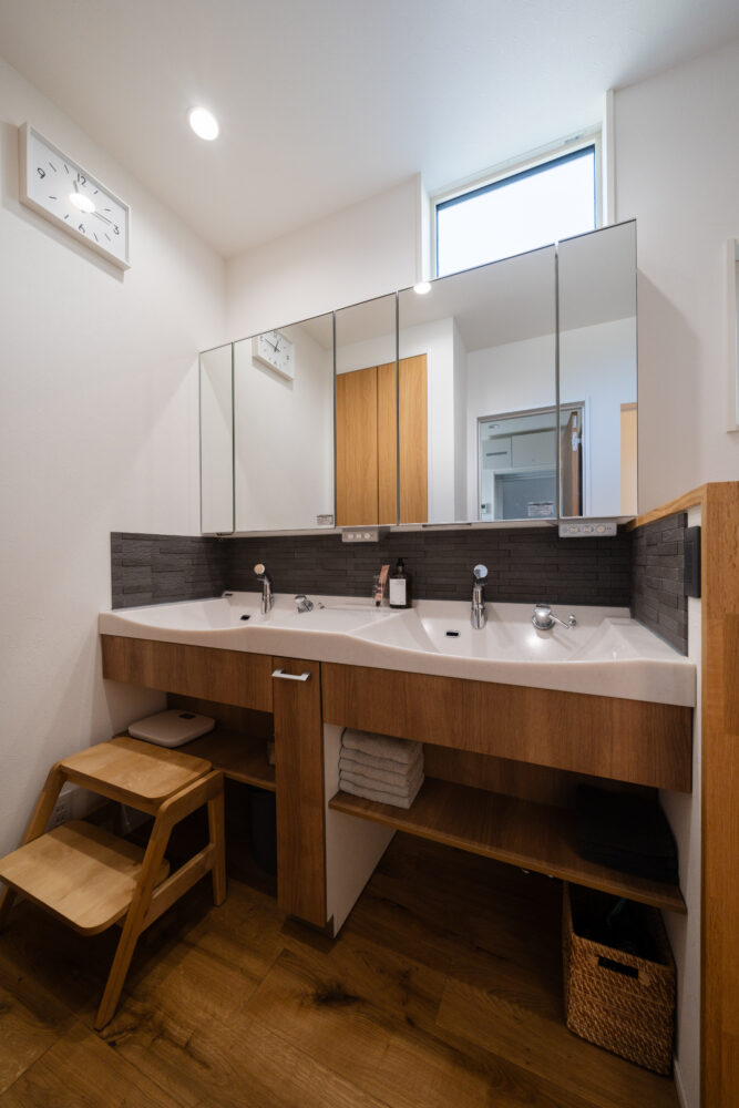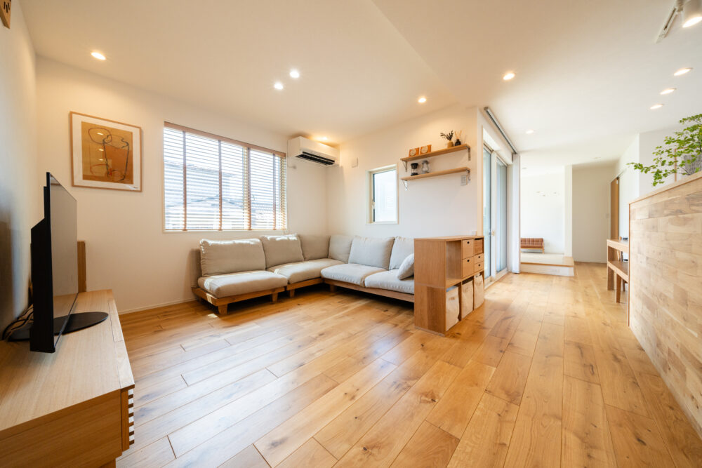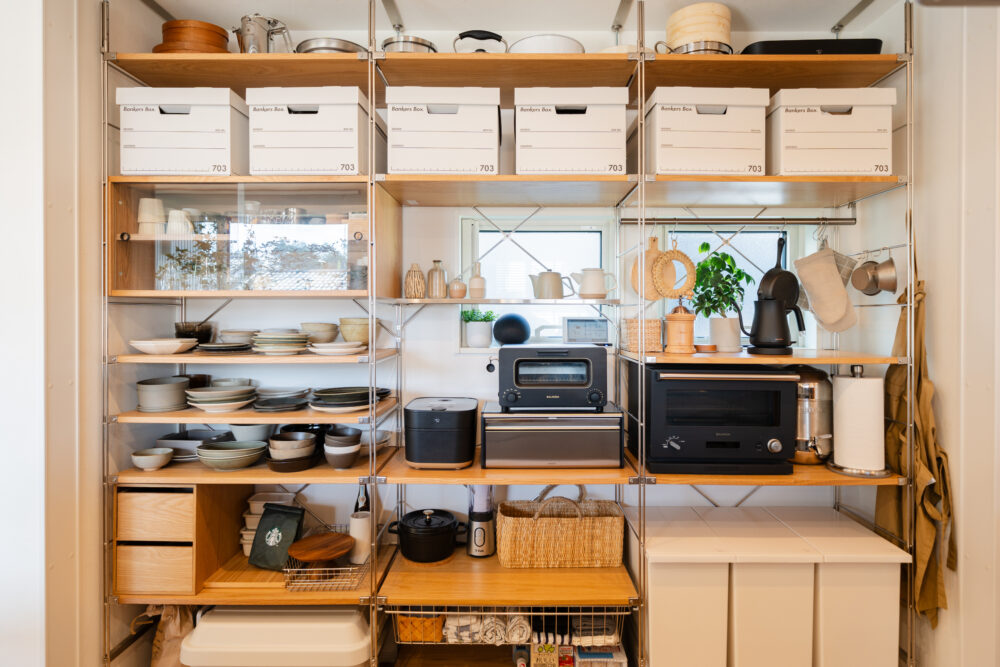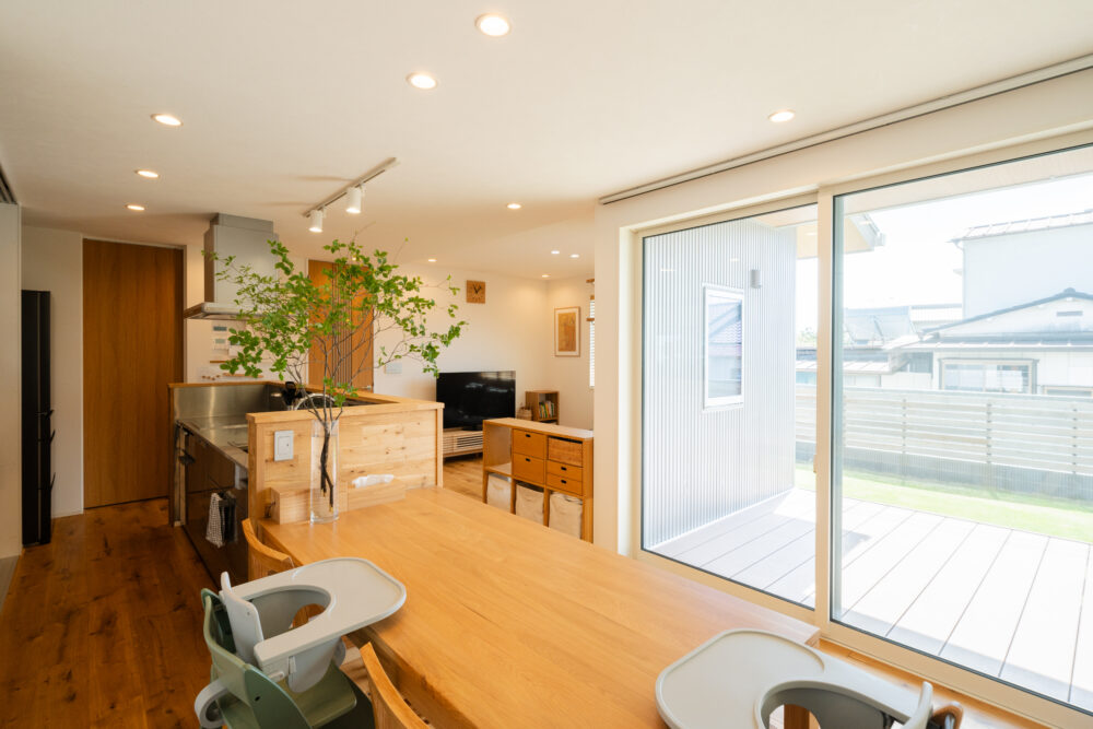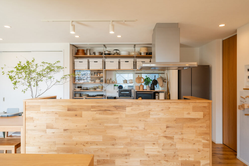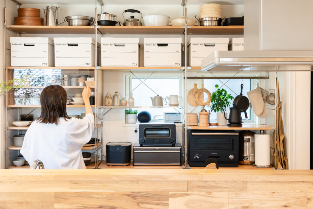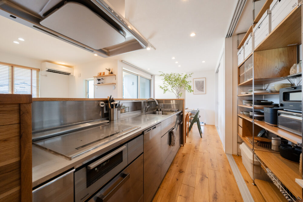 床や建具、キッチン、家具まで、オーク × ステンレスでテイストをそろえ統一感を持たせた内装デザイン。キッチンの背面収納は、あえてカップボードではなくユニットシェルフを採用することで「キッチンっぽさ」を出さず、家具のような、飾り棚のような雰囲気にしたところがこだわりポイントです。
